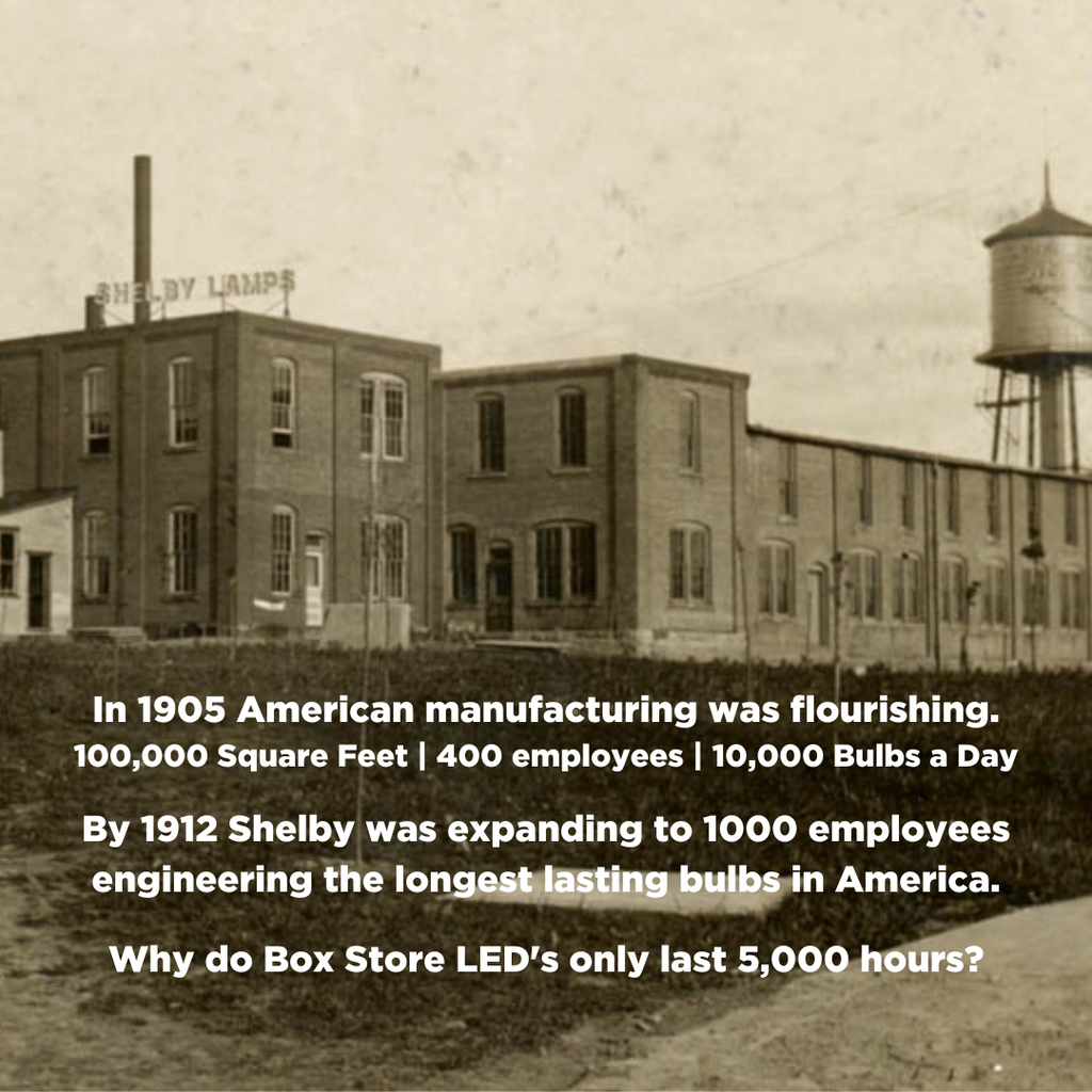 Shelby Electric manufactured light bulbs that could burn for 1 million hours. Some are still burning today. The fall of Shelby was the dawn of Planned Obsolescence.