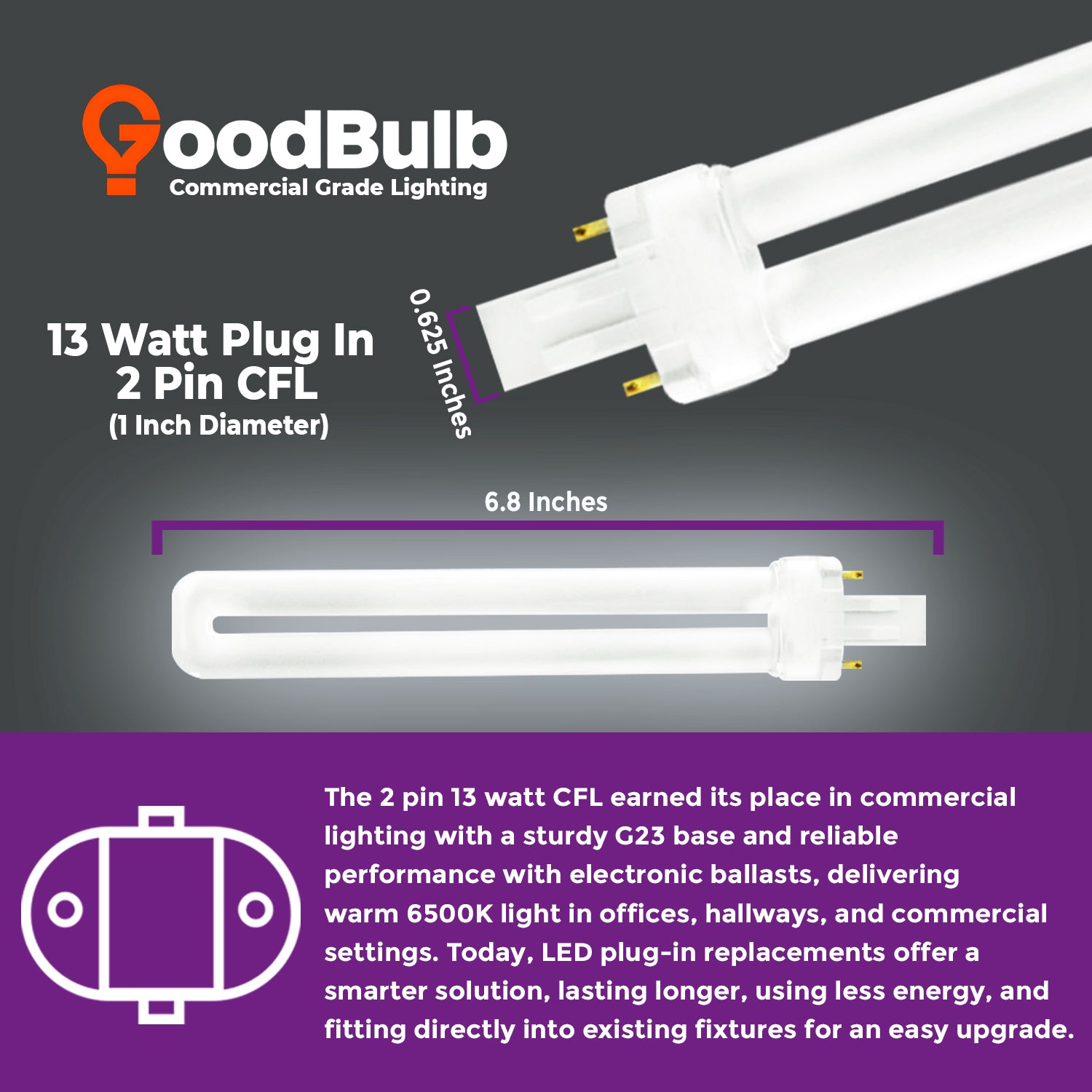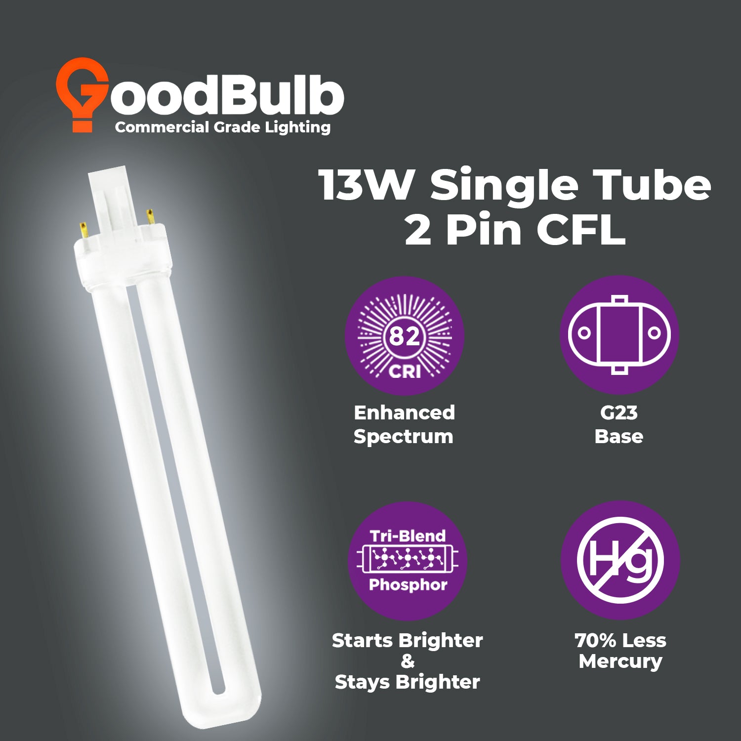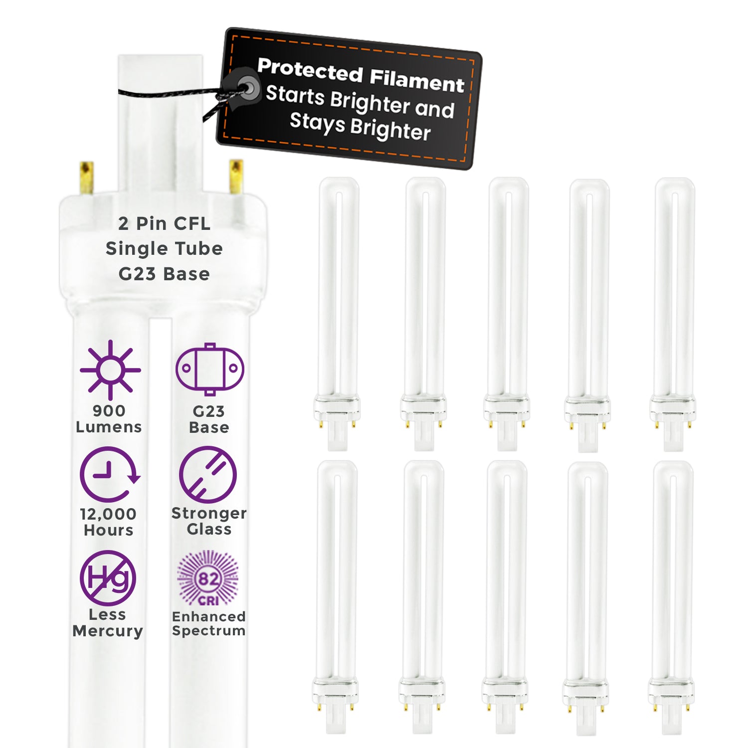 13 Watt CFL Light Bulbs - 2 Pin GX23 Base - 6500K Full Spectrum - 13W 900 Lumens - Single Tube Compact Fluorescent Light Bulbs Plug-in