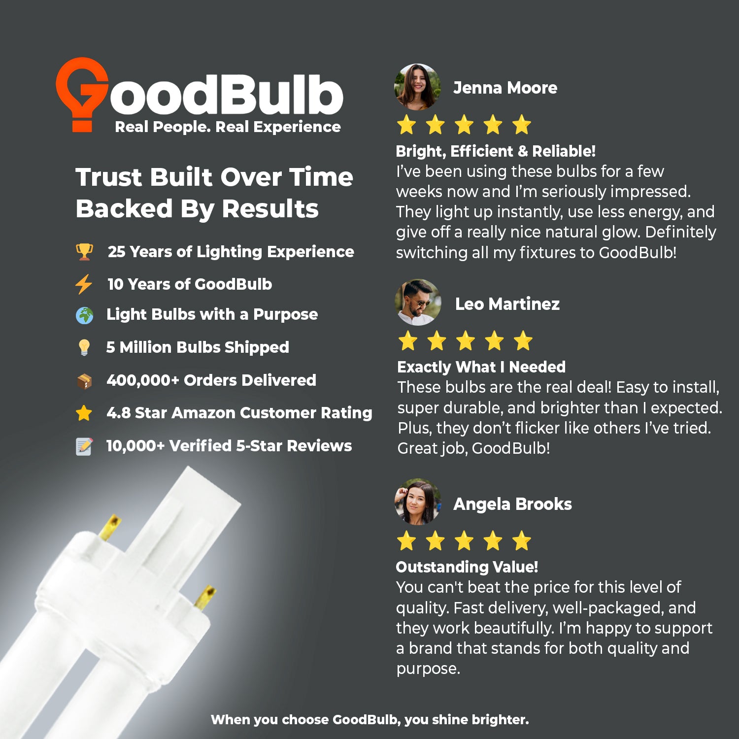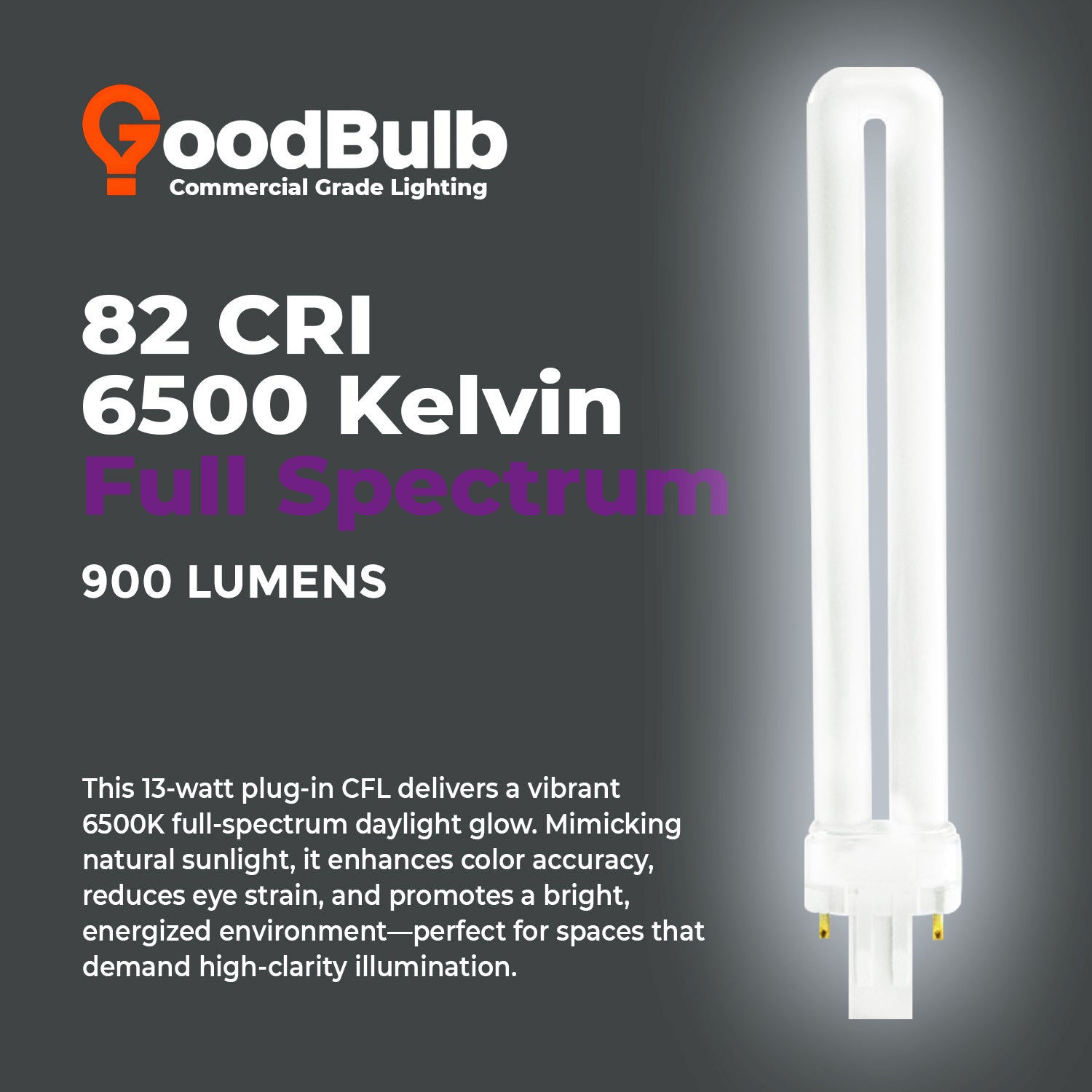 This 13-Watt CFL emits 900 lumens at 6500 Kelvin, providing a bright, full-spectrum daylight glow that enhances contrast, visibility, and focus. Ideal for offices, hospitals, laboratories, and task-oriented workspaces, this bulb delivers high-contrast, ultra-white illumination that reduces eye strain and improves precision. Designed with a GX23 2-pin base, it is perfect for task lighting, sconces, downlights, and under-cabinet fixtures.