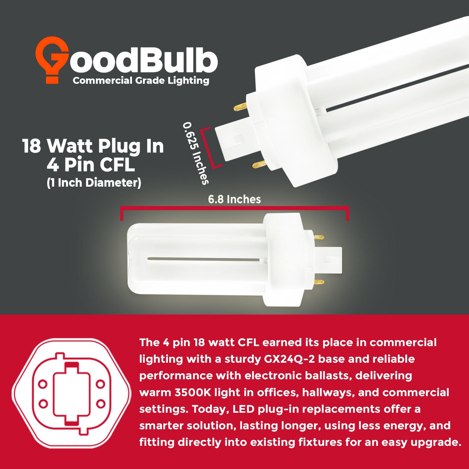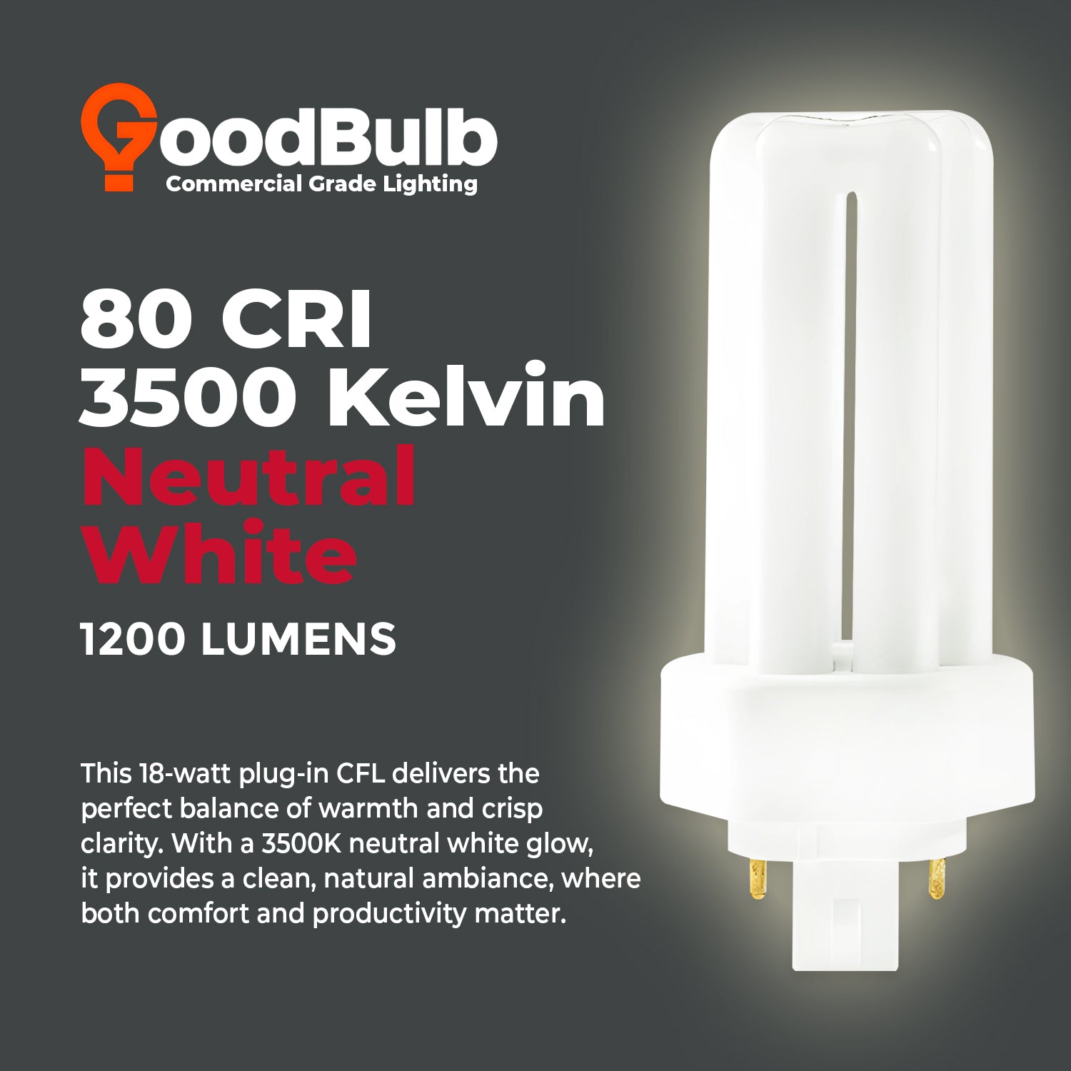 This 18-watt triple tube CFL plug-in bulb delivers 1200 lumens of balanced light in a 3500K Neutral White color temperature—ideal for commercial, residential, and office environments. Designed with a 4-pin GX24Q-2 base, this plug-in CFL offers high-efficiency performance and a color tone that supports focus without being too warm or cool.