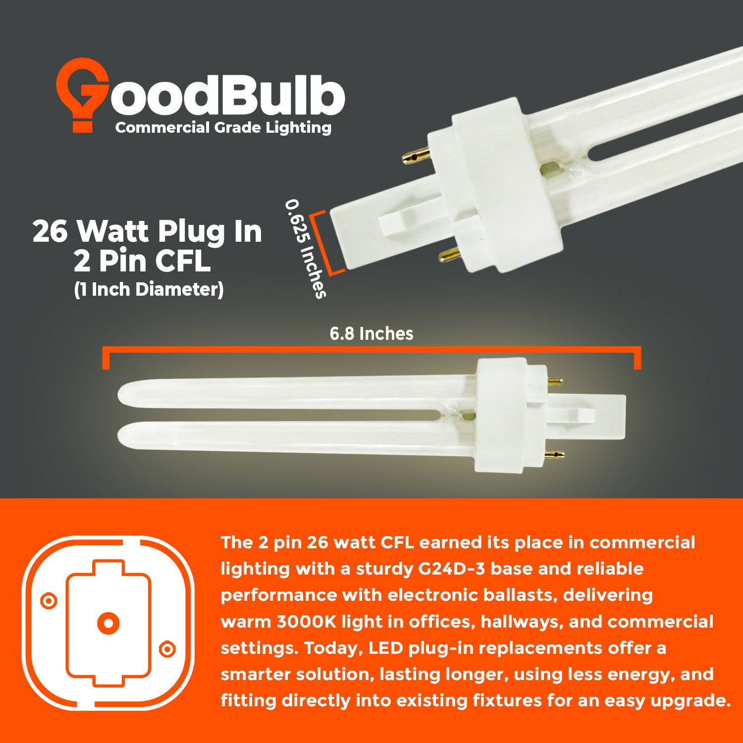 26 Watt CFL Bulbs - 3000K Soft White - 2 Pin G24D-3 - 26W 1800 Lumens - Double Tube Compact Fluorescent Plug-in