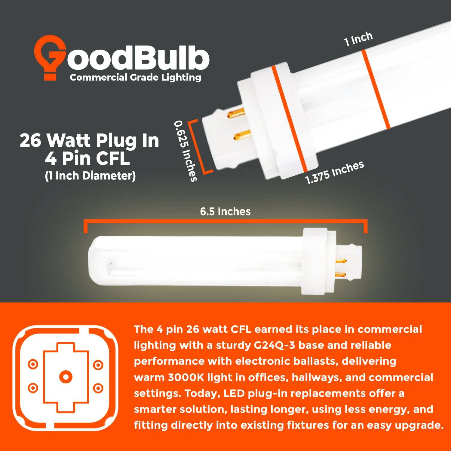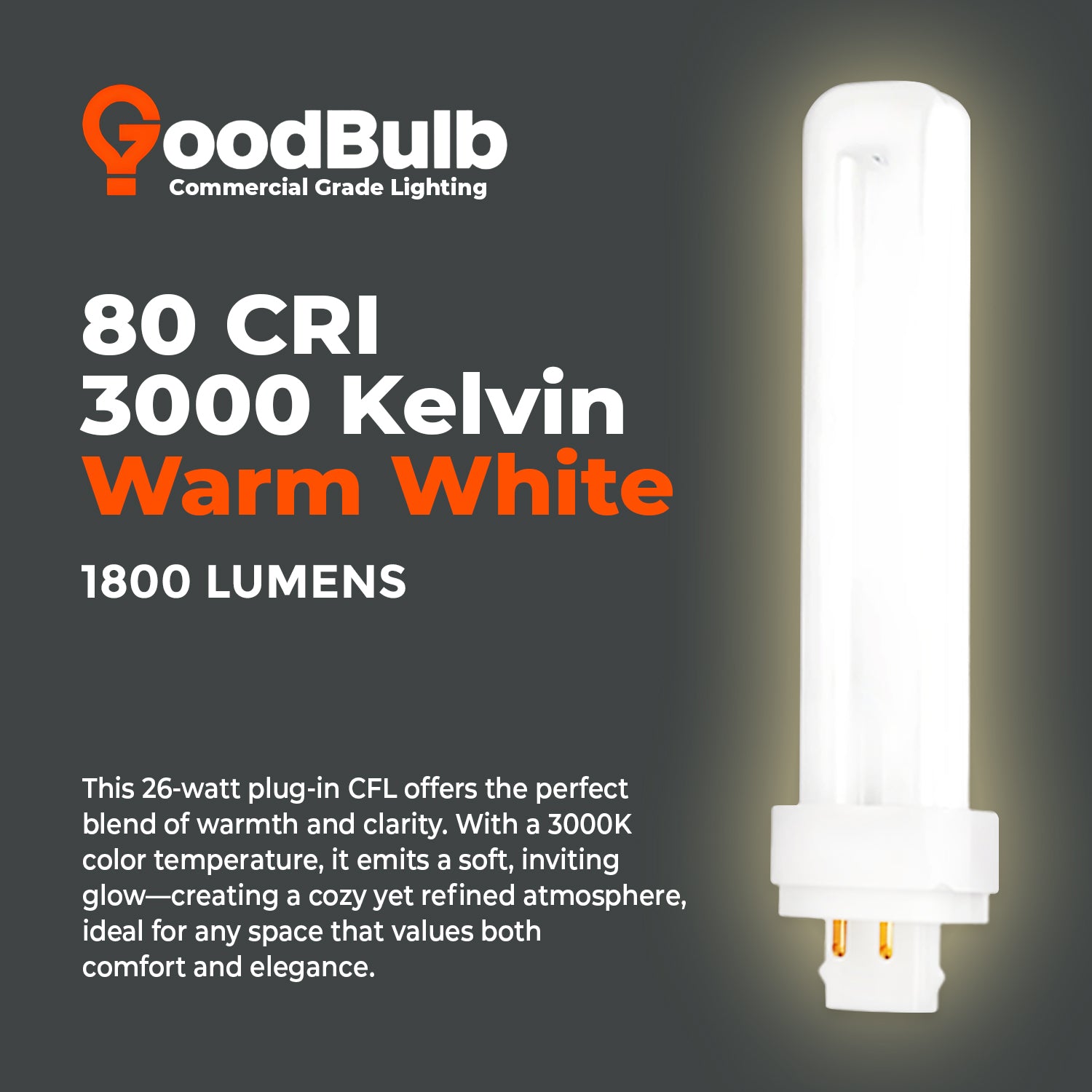 This 26-Watt CFL emits 1,800 lumens at 3000 Kelvin, producing a soft white glow that strikes the perfect balance between warm and professional. Ideal for commercial spaces, offices, hotels, and residential settings, this 4-pin double-tube compact fluorescent bulb is commonly used in recessed cans, sconces, and ceiling fixtures where clean, inviting light is essential.