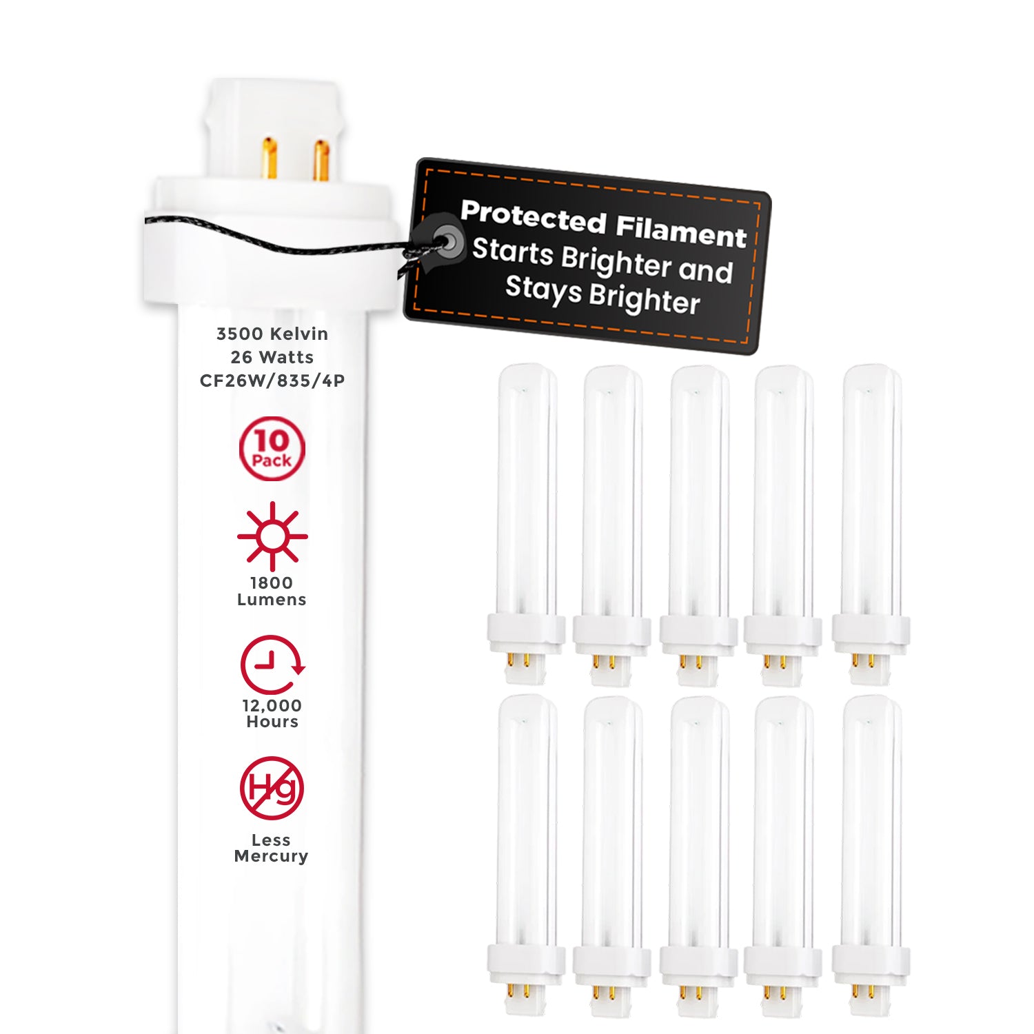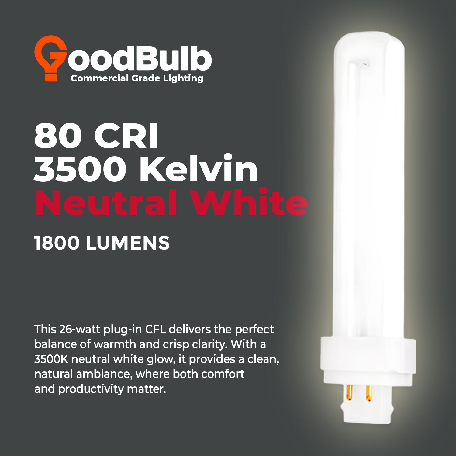 26 Watt CFL Light Bulbs - 3500K Neutral White - 4 Pin G24Q-3 - 26W 1800 Lumens - Double Tube Compact Fluorescent Light Bulbs Plug-in