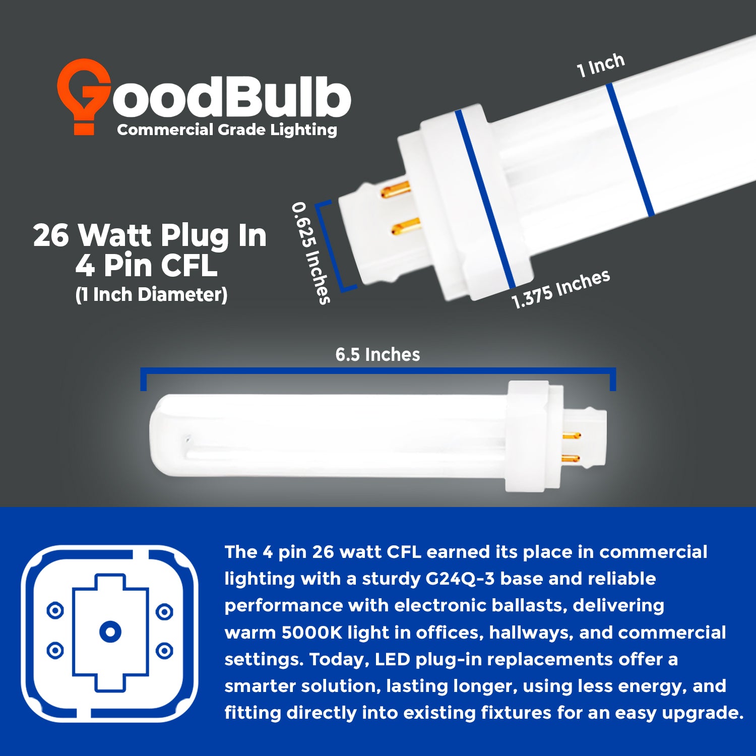 This 26-Watt CFL emits 1,800 lumens at 5000 Kelvin, delivering a bright daylight glow that mimics natural sunlight. The 4-pin double-tube design is commonly used in offices, classrooms, commercial buildings, and industrial facilities where sharp, energizing light is essential for visibility, focus, and productivity.