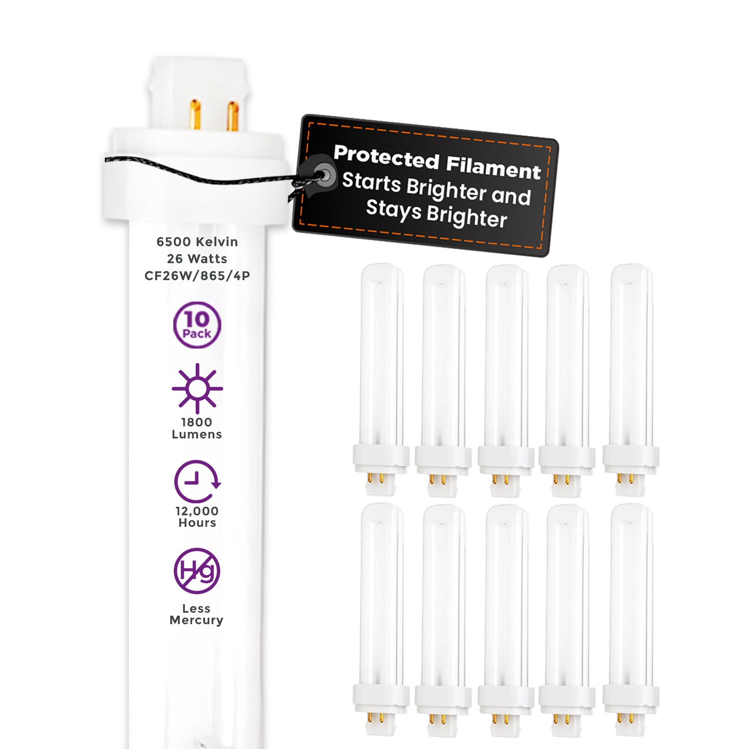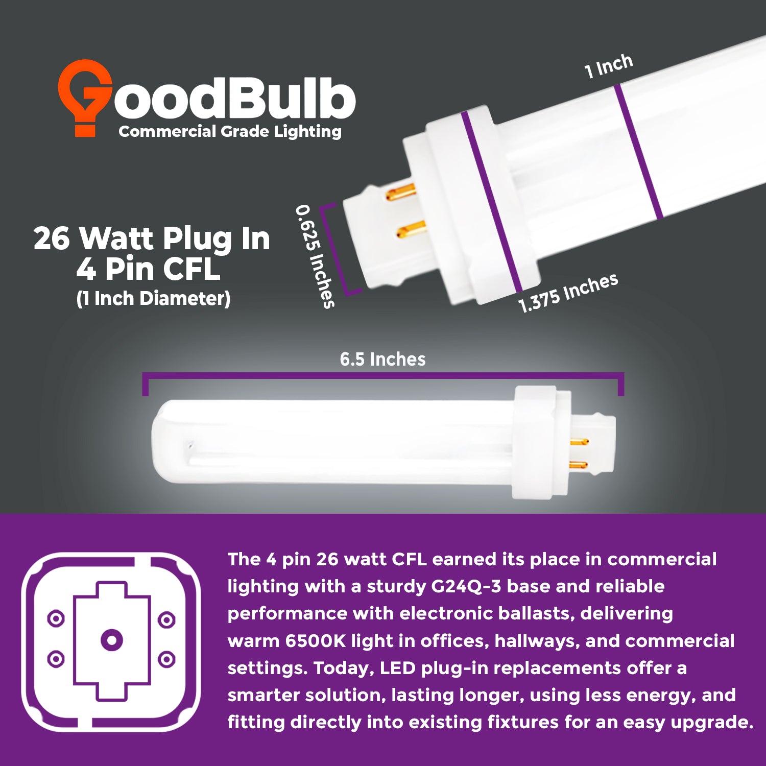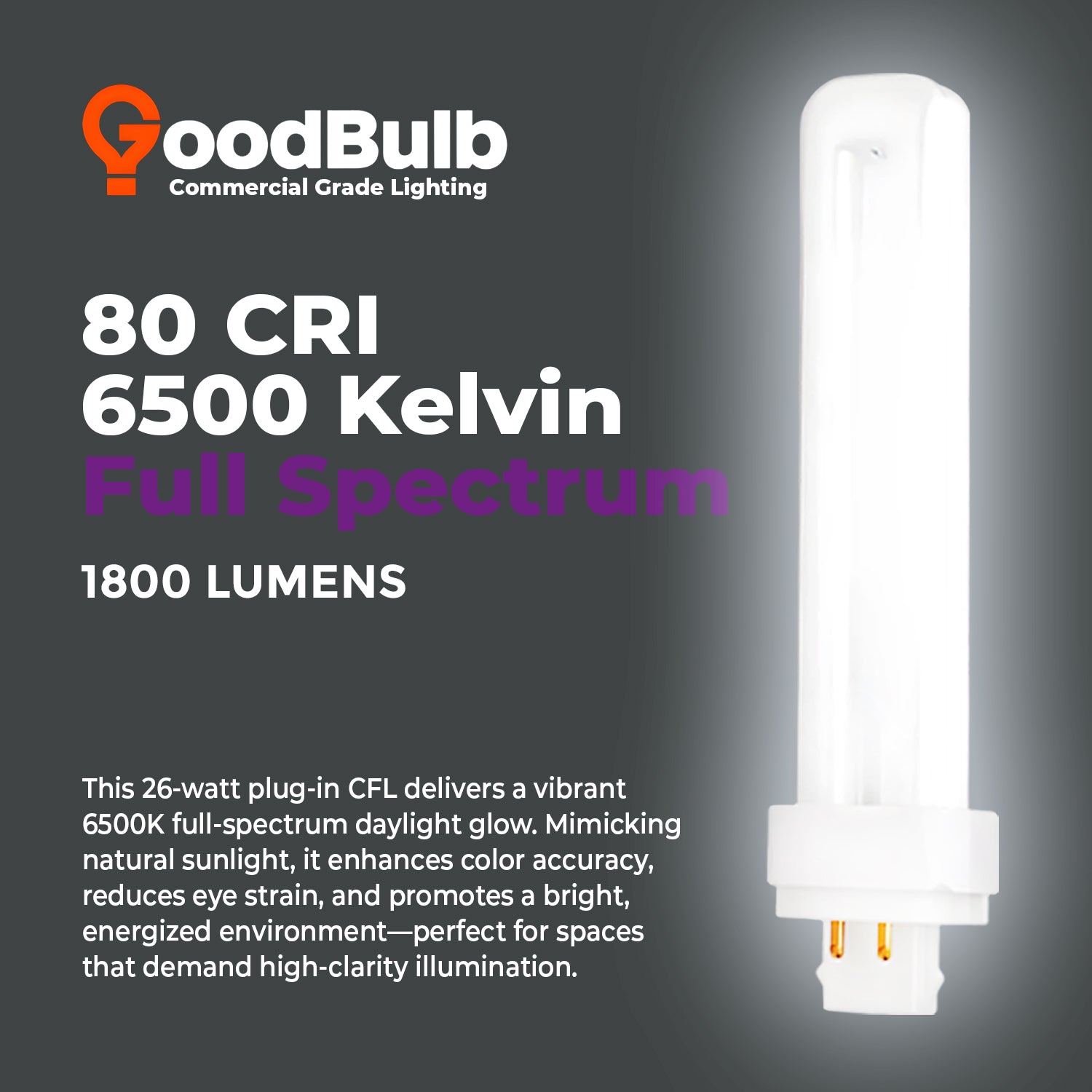 26 Watt CFL Light Bulbs - 6500K Full Spectrum - 4 Pin G24Q-3 - 26W 1800 Lumens - Double Tube Compact Fluorescent Light Bulbs Plug-in