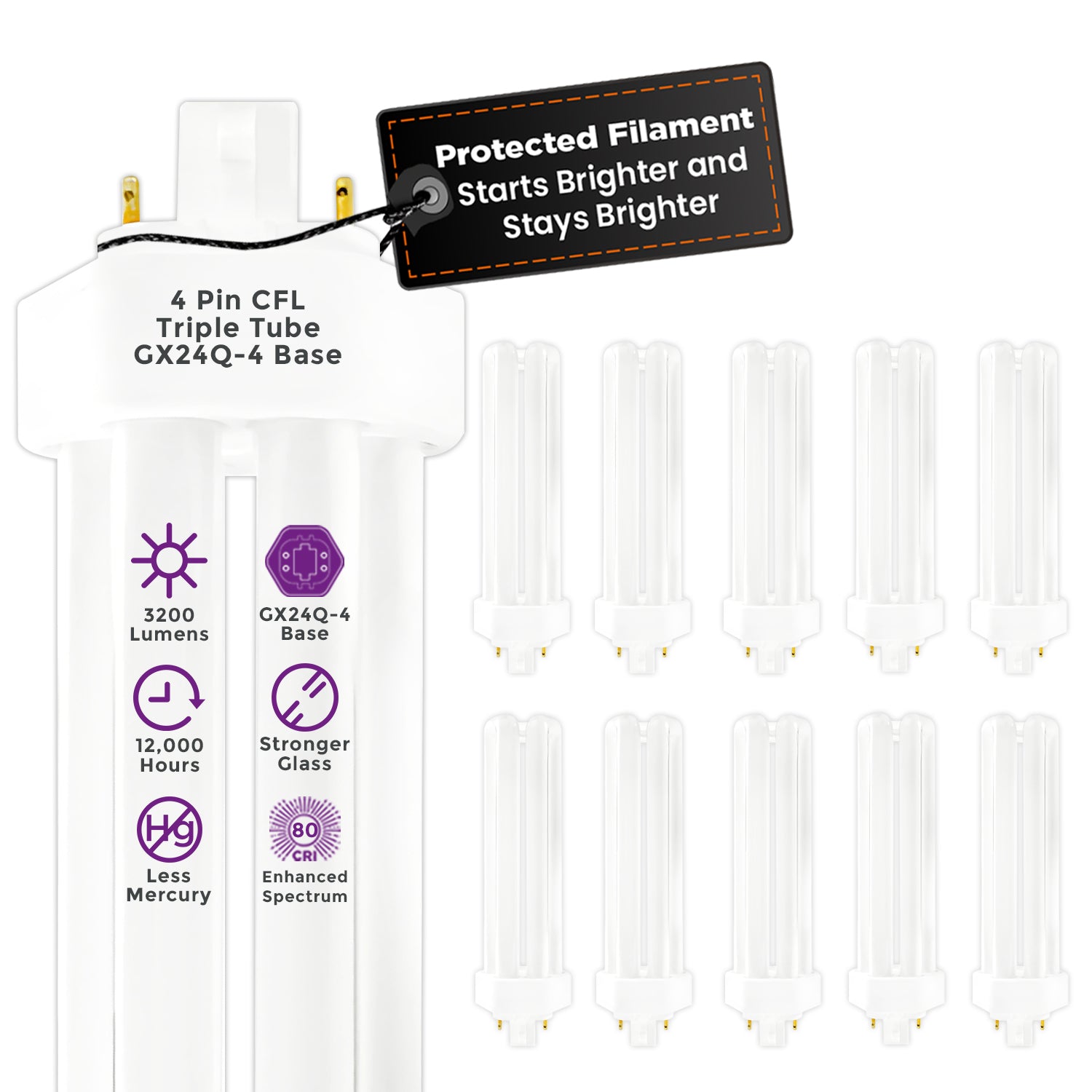 42 Watt CFL Light Bulbs - 4 Pin GX24Q-4 Base - 6500K Full Spectrum - 42W 3200 Lumens - Triple Tube Compact Fluorescent Light Bulbs Plug-in