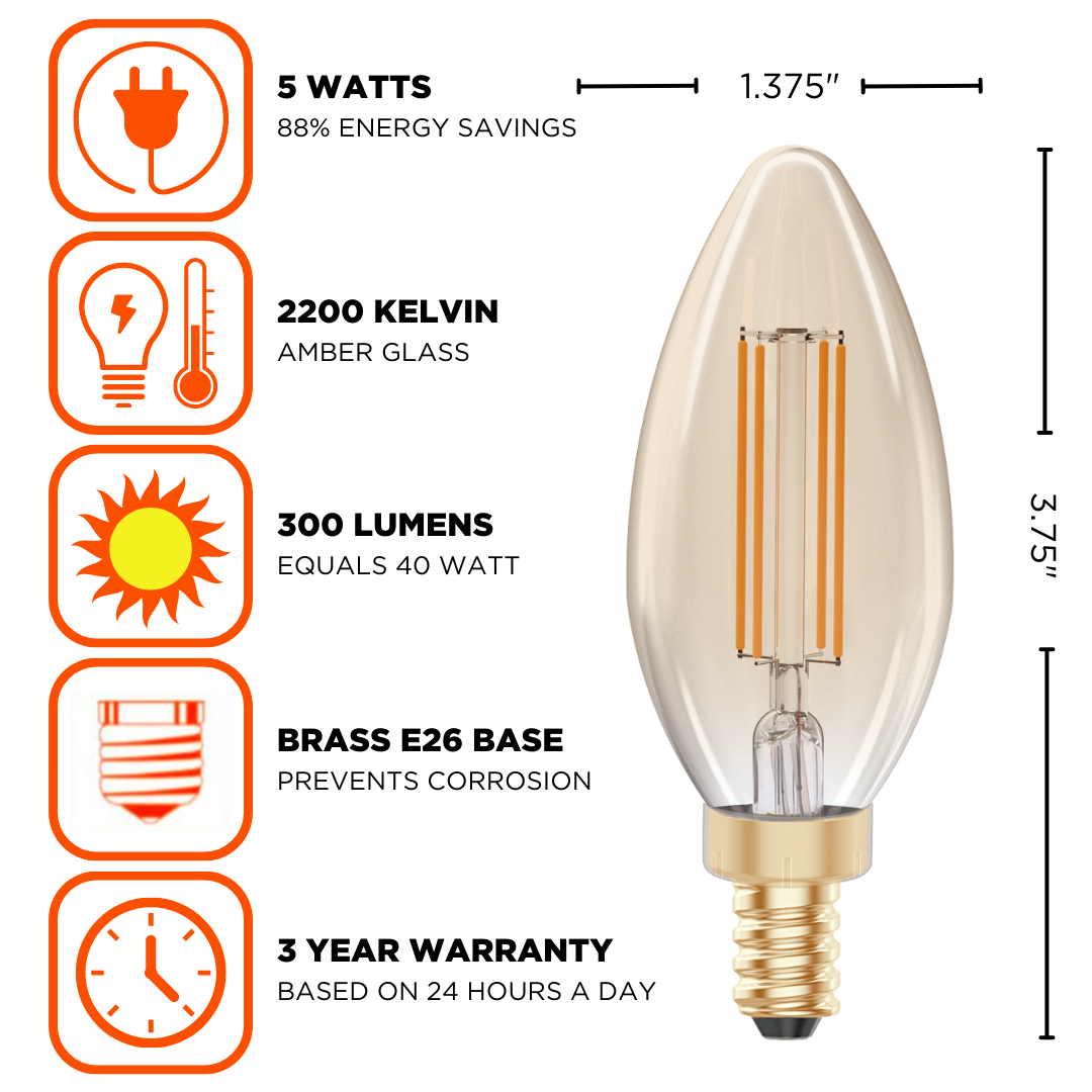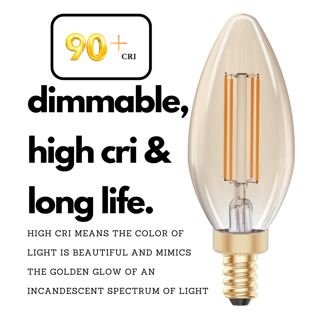 40 WATT EQUAL ā 5 WATT CLEAR GOLDEN FINISH E12 CHANDELIER LED ā 90+ HIGH CRI ā SERENE SUNSET WARM LIGHT ā 300 LUMENS ā 2200 KELVIN ā THICK FILAMENT - 3 YEAR WARRANTY