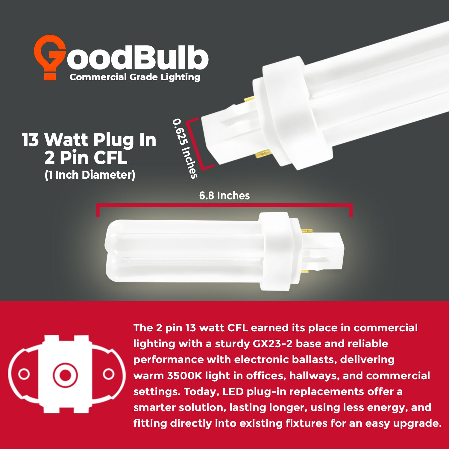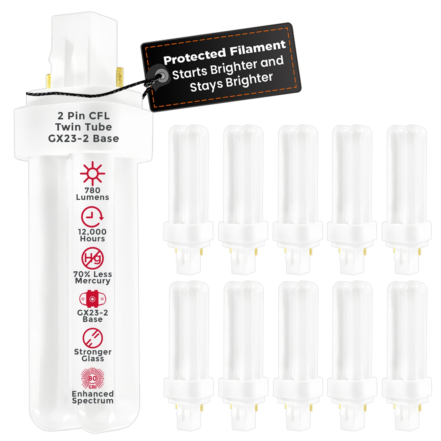 Delivering brightness equivalent to higher-wattage incandescent bulbs, this 13-watt CFL is designed to reduce energy consumption while maintaining excellent light quality. Built with a 2-pin GX23-2 base, it installs quickly and easily into compatible fixtures, offering a reliable replacement for outdated bulbs without compromising performance.