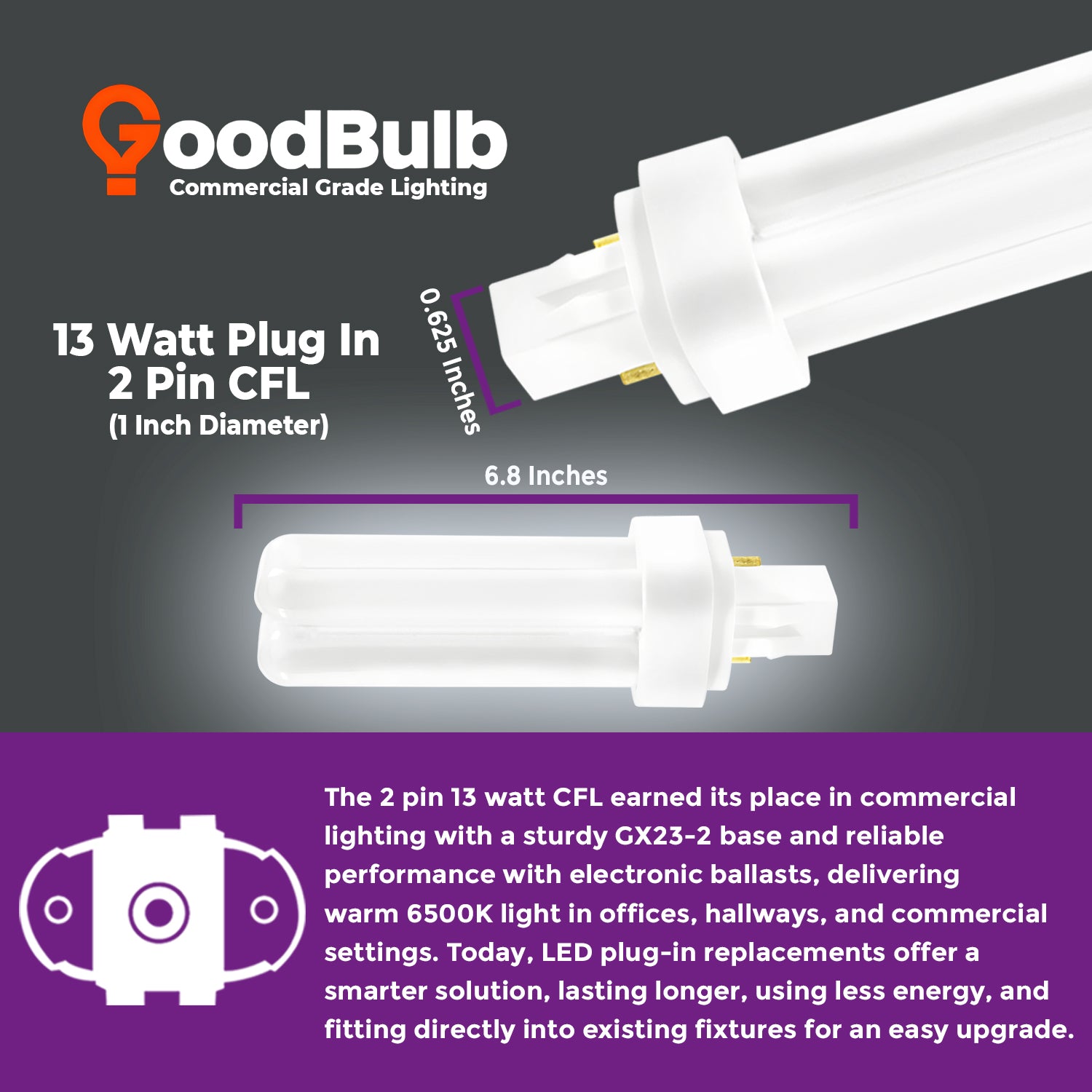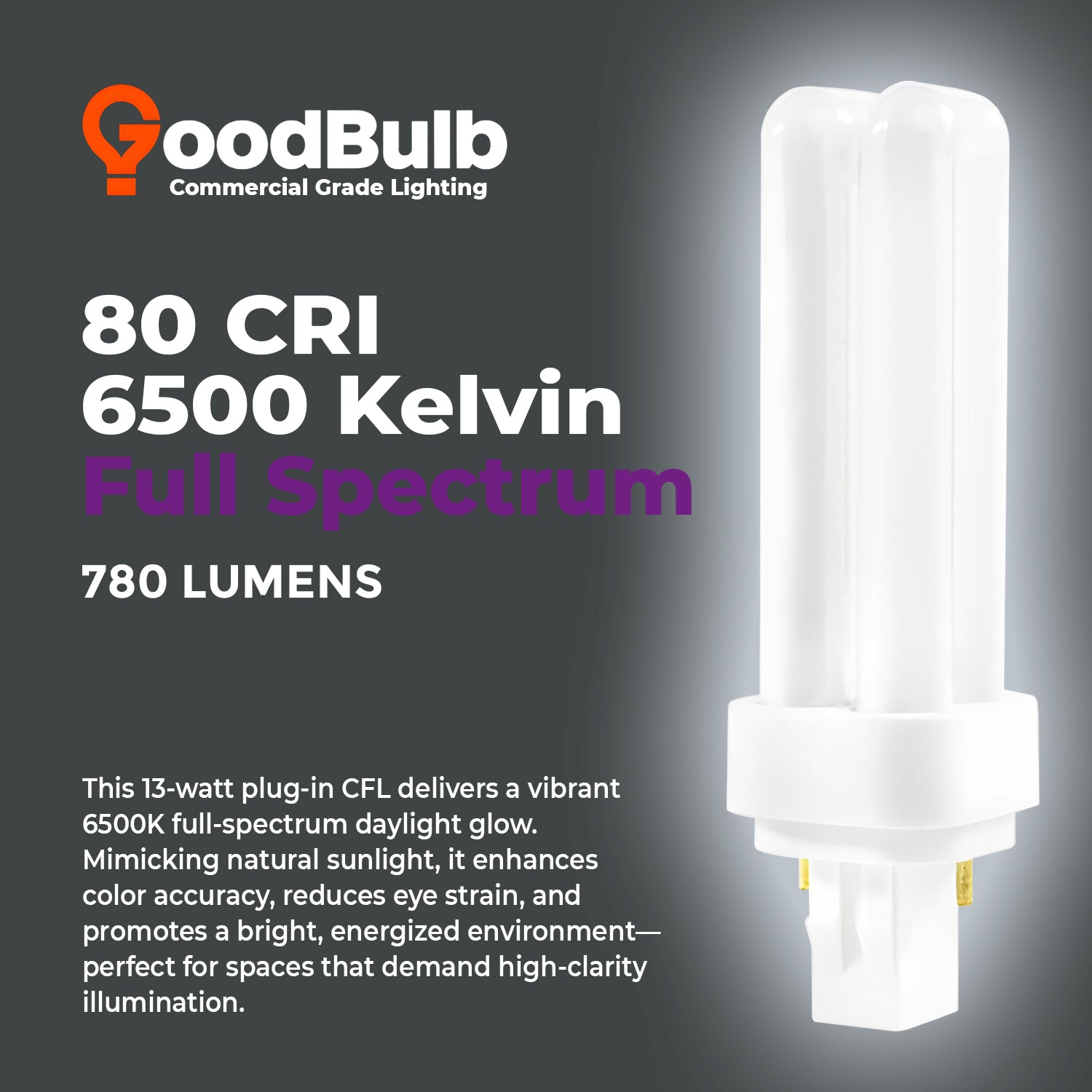 The CF13W/GX23-2/865 compact fluorescent lamp delivers powerful efficiency with a vibrant 6500 Kelvin full spectrum daylight glow. Producing 780 lumens of crisp, bright illumination, this 13-watt plug-in CFL creates a refreshing environment that enhances visibility and focus. Its daylight-balanced output is perfect for offices, schools, healthcare facilities, retail spaces, and task-oriented work areas where clarity and alertness are essential. With its energizing white light, this lamp supports productivity and precision while closely replicating the quality of natural sunlight.
