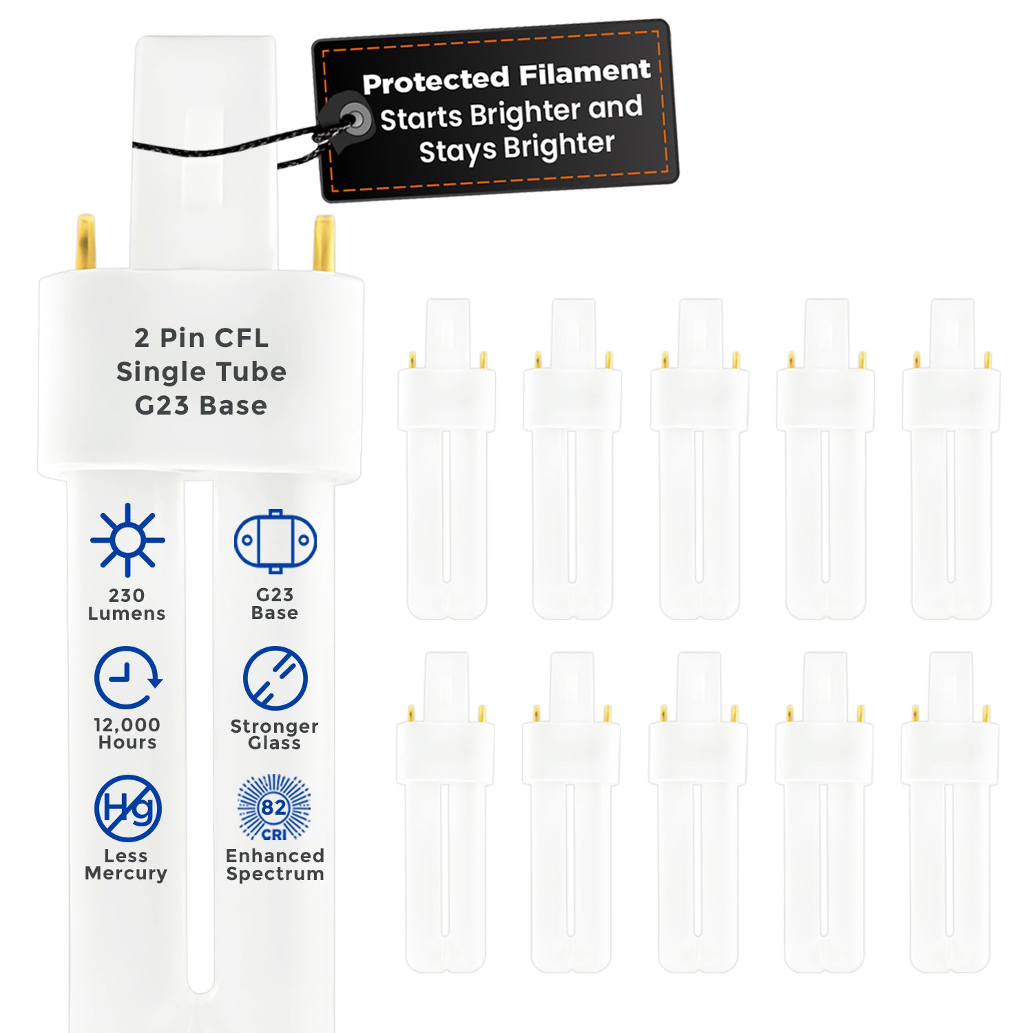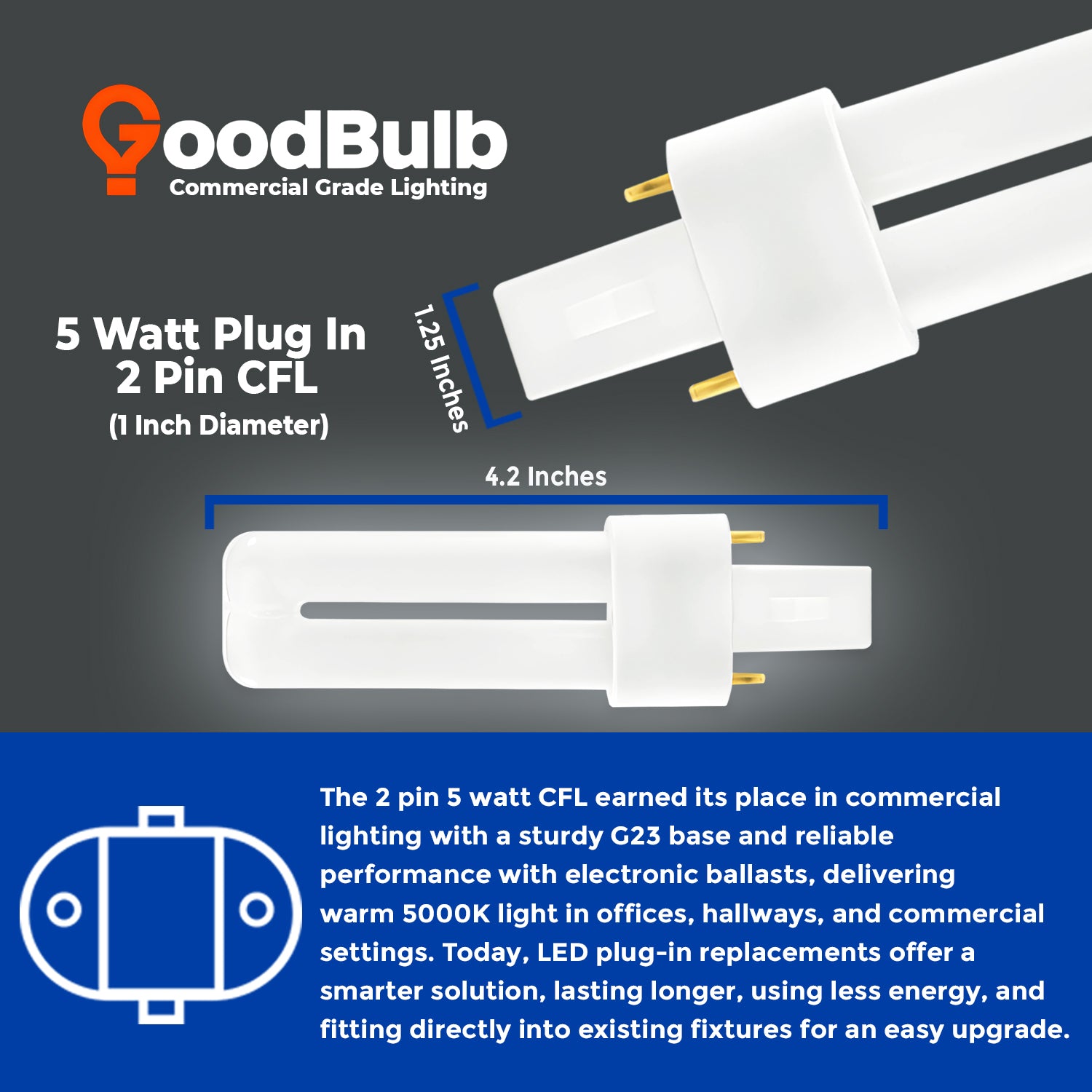 The Compact Fluorescent Lamp delivers crisp, high-clarity illumination with a 5000 Kelvin pure white glow, ideal for environments where visual accuracy and alertness are essential. With a compact single-tube design and a G23 2-pin base, this 5-watt CFL provides 230 lumens of bright, uniform light output while maintaining an 82 CRI (Color Rendering Index) for true-to-life color reproduction.