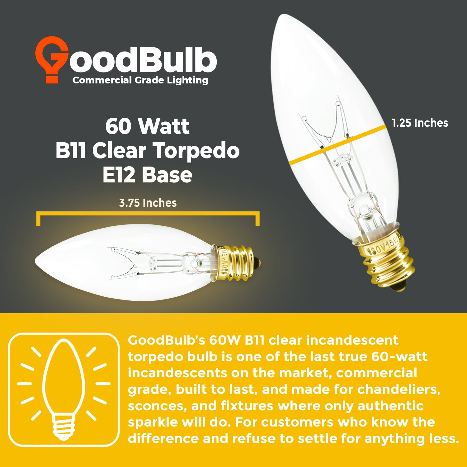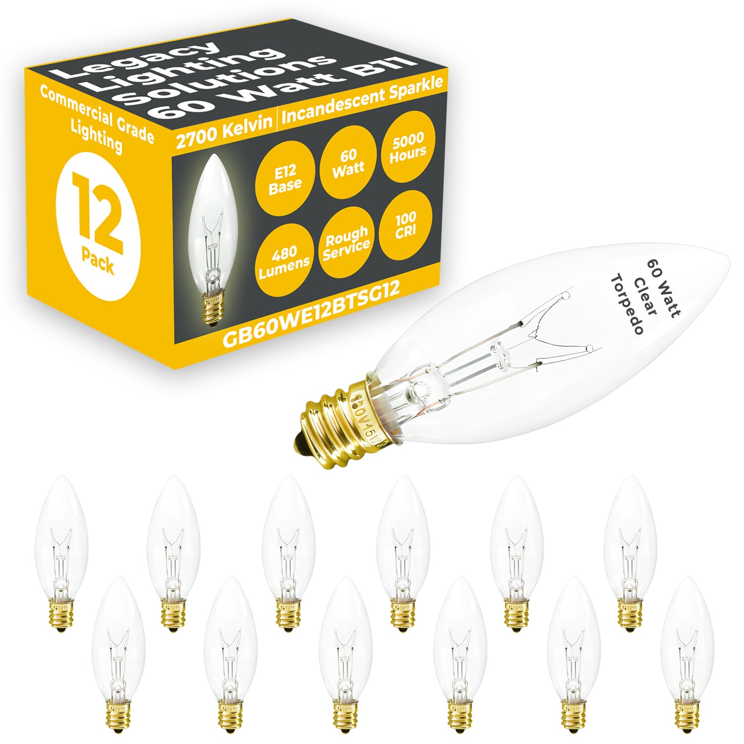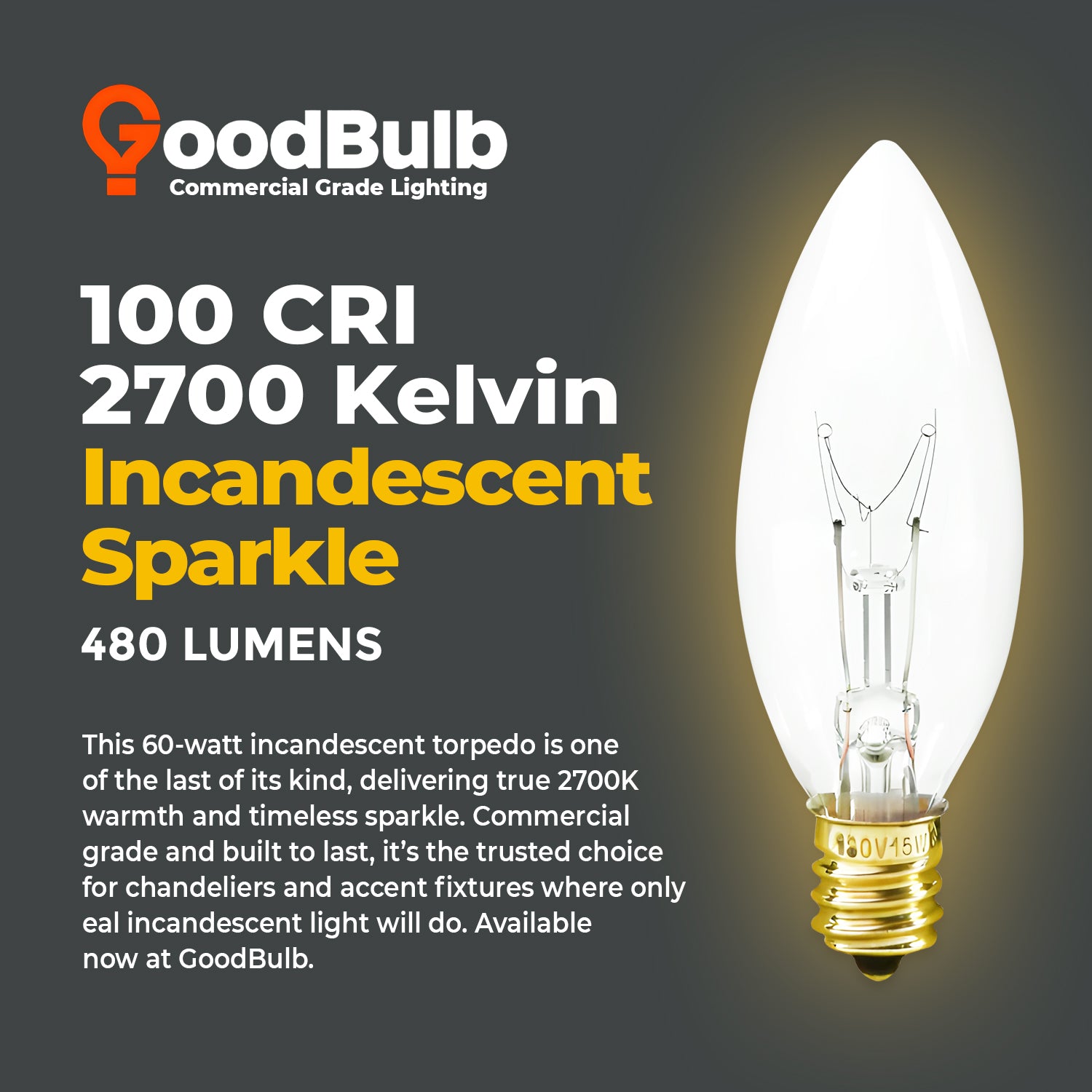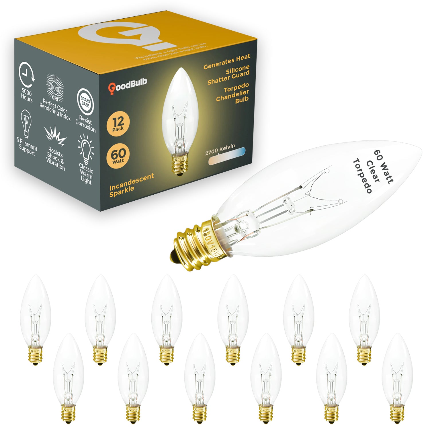 This 60-watt incandescent chandelier bulb with a clear torpedo shape emits 480 lumens of bright, inviting light. Featuring a color temperature of 2700 Kelvin (Warm White), it creates a soft, welcoming glow perfect for chandeliers, sconces, and decorative fixtures. The E12 brass base ensures compatibility with a wide range of candelabra-style lighting, while the silicone shatter guard finish provides added durability, extending the bulb's life to 5,000 hours.