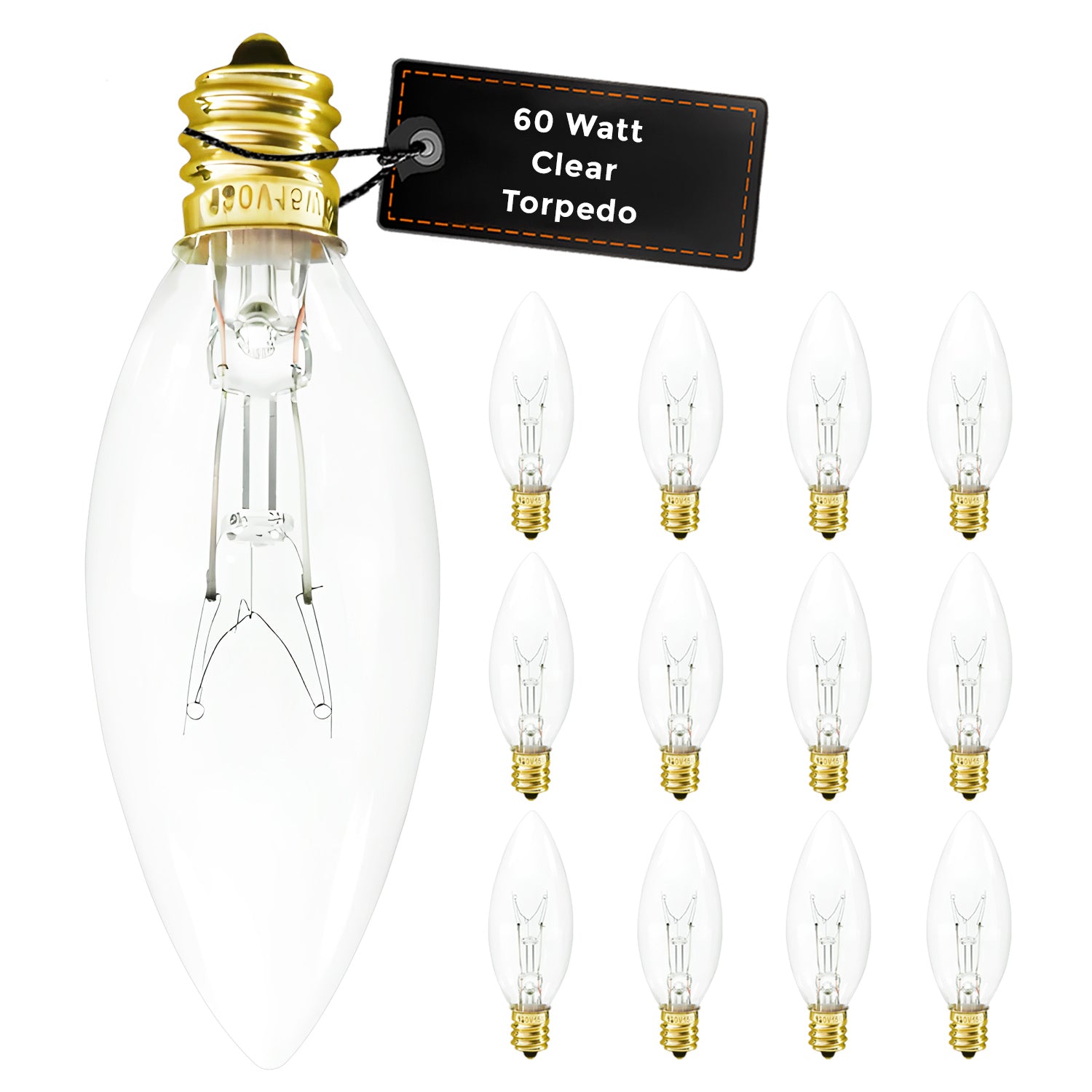 Incandescent Chandelier Light Bulb - 60 Watts 480 Lumens - Clear Torpedo Shape - 5000 Life Hours - 120 Volts - E12 Brass Base - Silicone Shatter Guard Finish