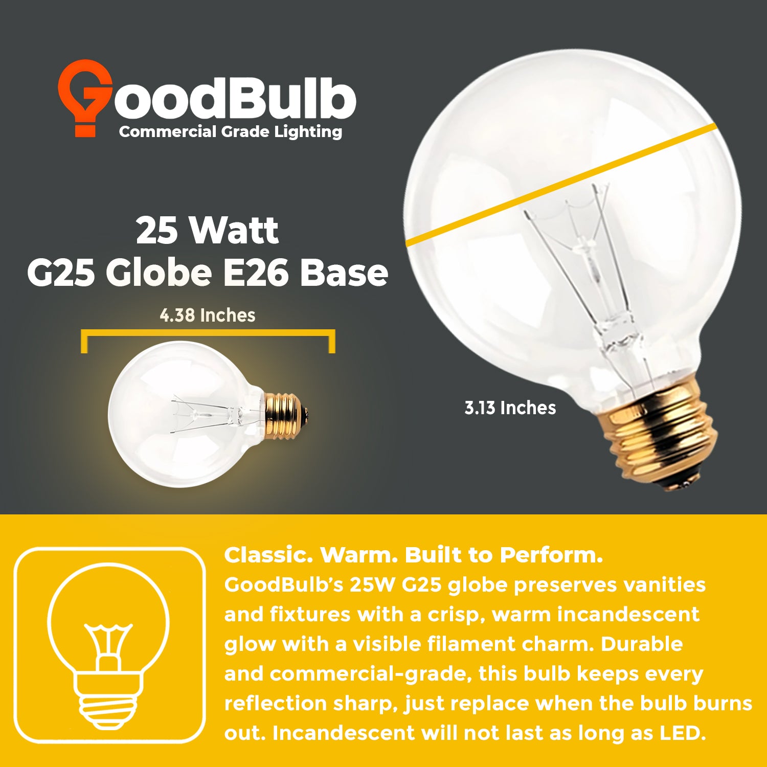 Incandescent Vanity Light Bulb - 25 Watts - G25 Globe - 150 Lumens - 2500 Life Hours - 120 Volts - E26 Brass Base - Clear Finish