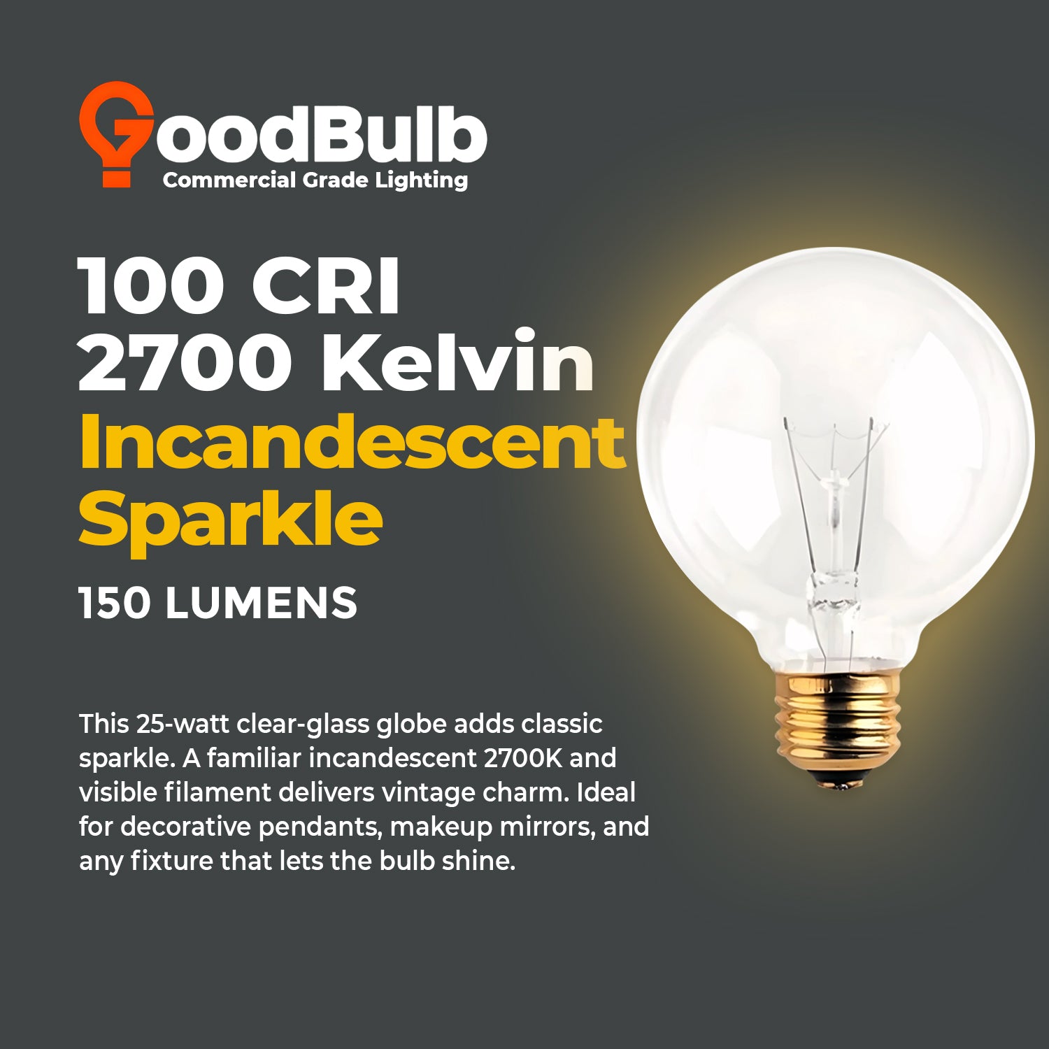 Globe-shaped incandescent light bulb with a standard E26 brass base and a clear finish. Emitting 150 lumens at 2500 Kelvin Warm White, this 25-watt bulb produces a classic, inviting glow ideal for decorative lighting in vanities, bathrooms, salons, and dressing areas. With a rated life of 2,500 hours, it offers dependable illumination for stylish, everyday use.