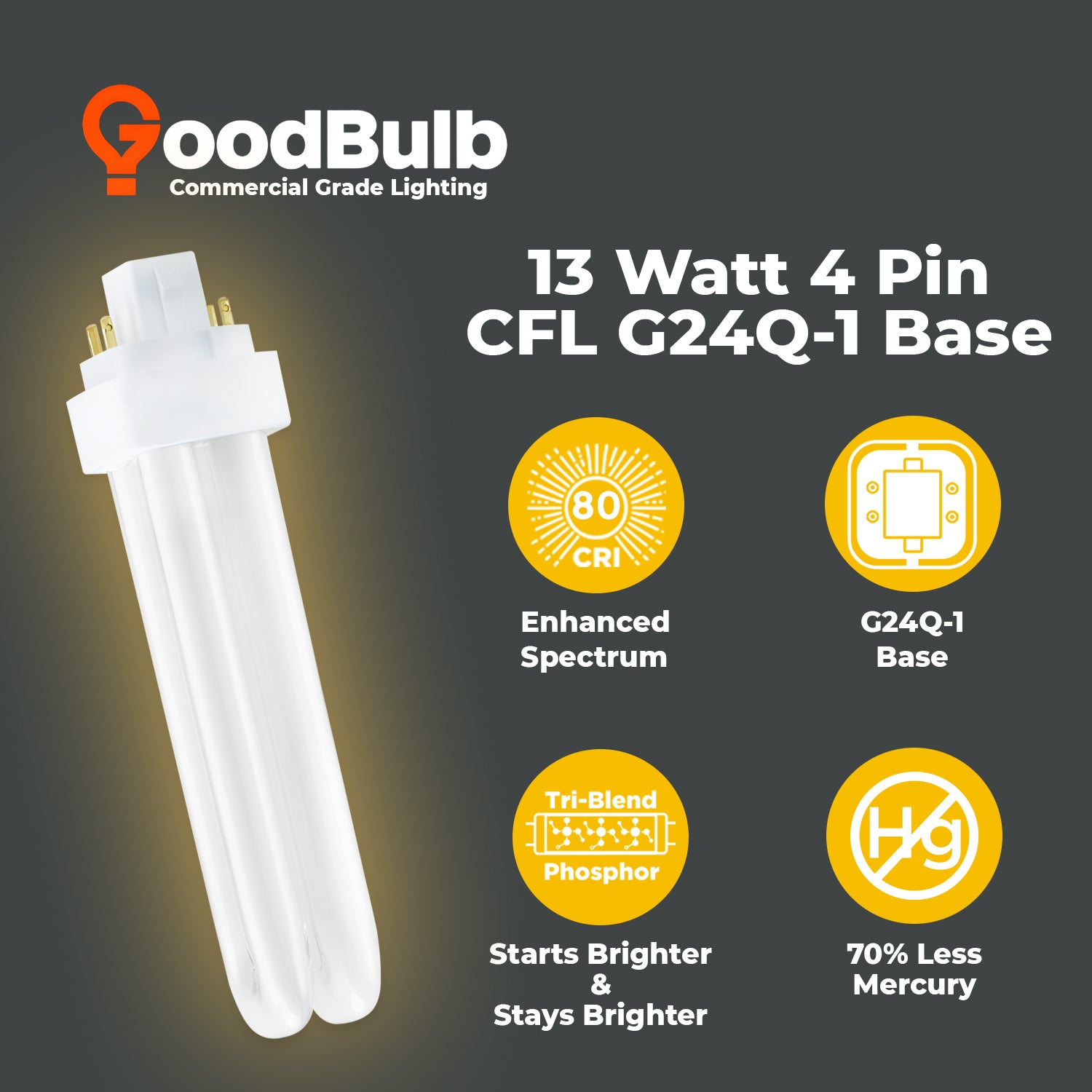 The GoodBulb 13 Watt CFL Plug-In Light Bulb delivers warm, comfortable lighting with a soothing 2700K soft white glow—perfect for spaces that prioritize relaxation, hospitality, and visual warmth. Designed with a double-tube configuration and a reliable G24Q-1 4-pin base, this compact fluorescent lamp produces 900 lumens while drawing just 13 watts, offering an energy-efficient solution for ambient lighting in commercial and residential applications.