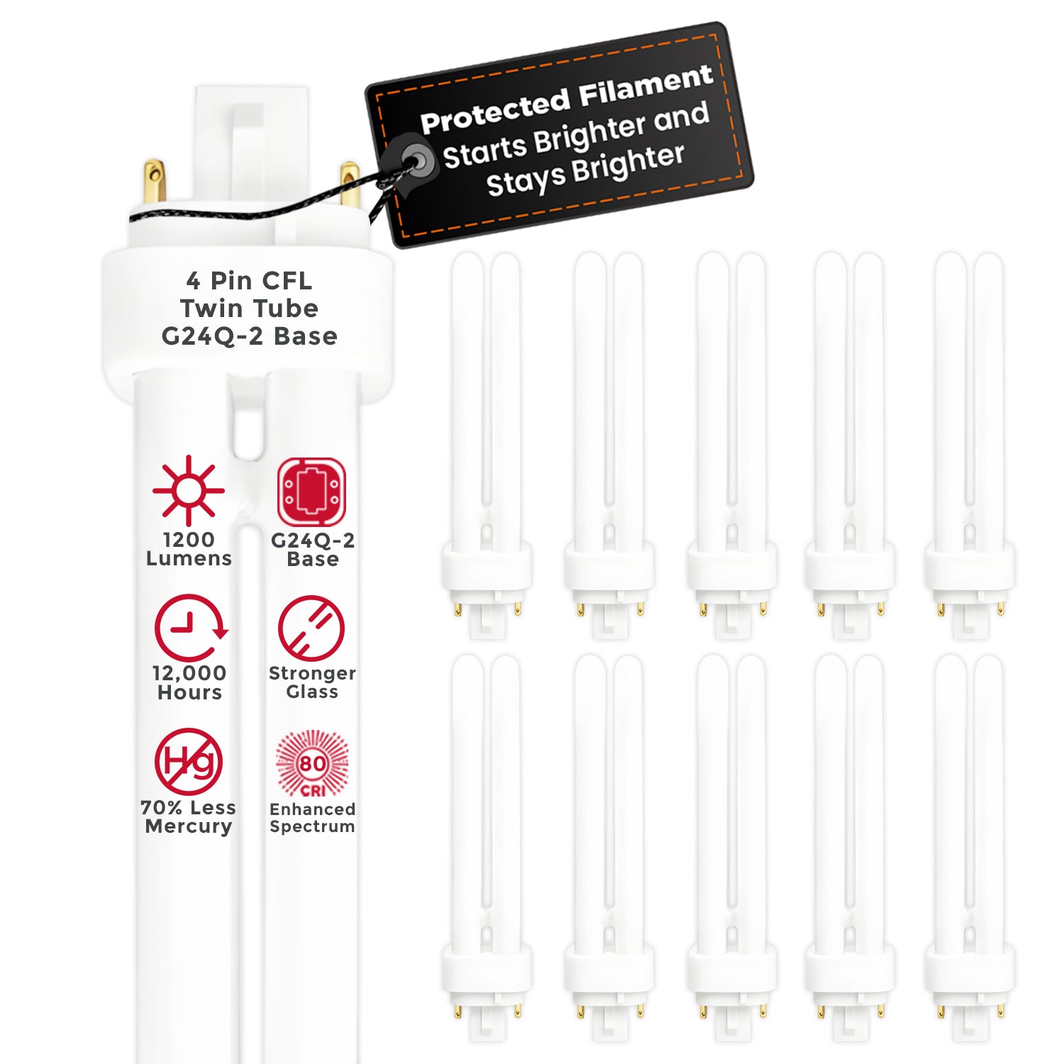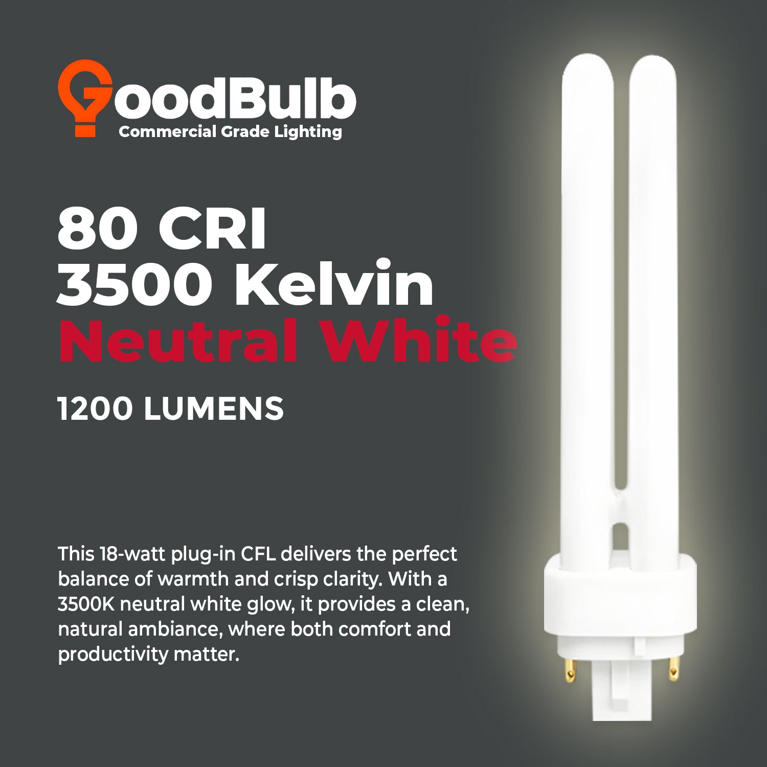 The GoodBulb 18 Watt CFL Plug-In Light Bulb delivers efficient and consistent lighting with a balanced 3500K neutral white tone—perfect for professional settings where clarity and comfort are both essential. Engineered with a double twin-tube design and a G24Q-2 4-pin base, this lamp emits 1200 lumens of clean, uniform light while consuming only 18 watts of power, making it a reliable solution for high-traffic, energy-conscious environments.