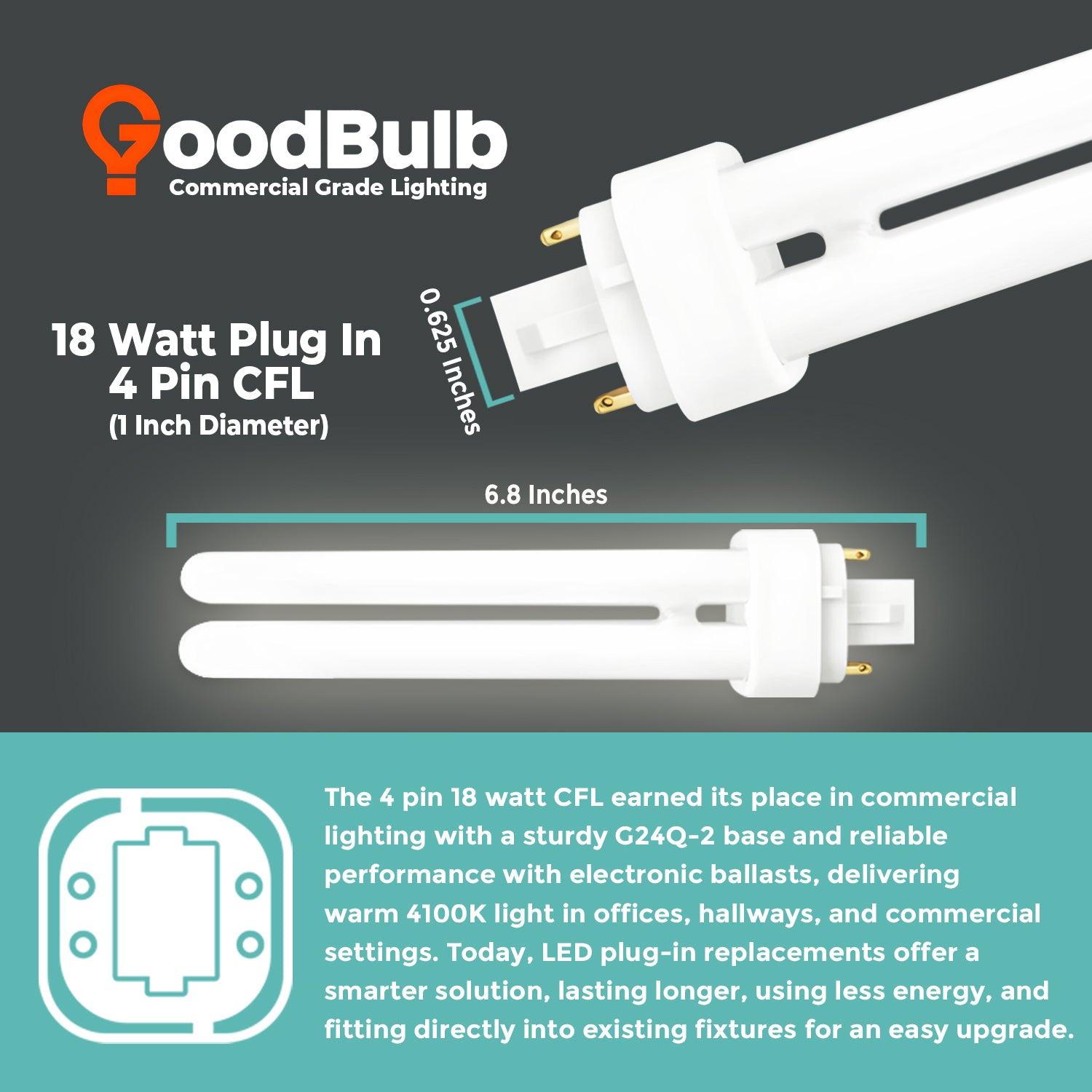 The GoodBulb 18 Watt CFL Plug-In Light Bulb provides clear, reliable illumination with a 4100K cool white tone—perfect for functional spaces that require sharp visibility and a clean, neutral atmosphere. Designed with a compact double twin-tube (DT) construction and a G24Q-2 4-pin base, this lamp produces 1200 lumens of bright, efficient light while consuming only 18 watts of power, making it a dependable choice for commercial and facility lighting applications.