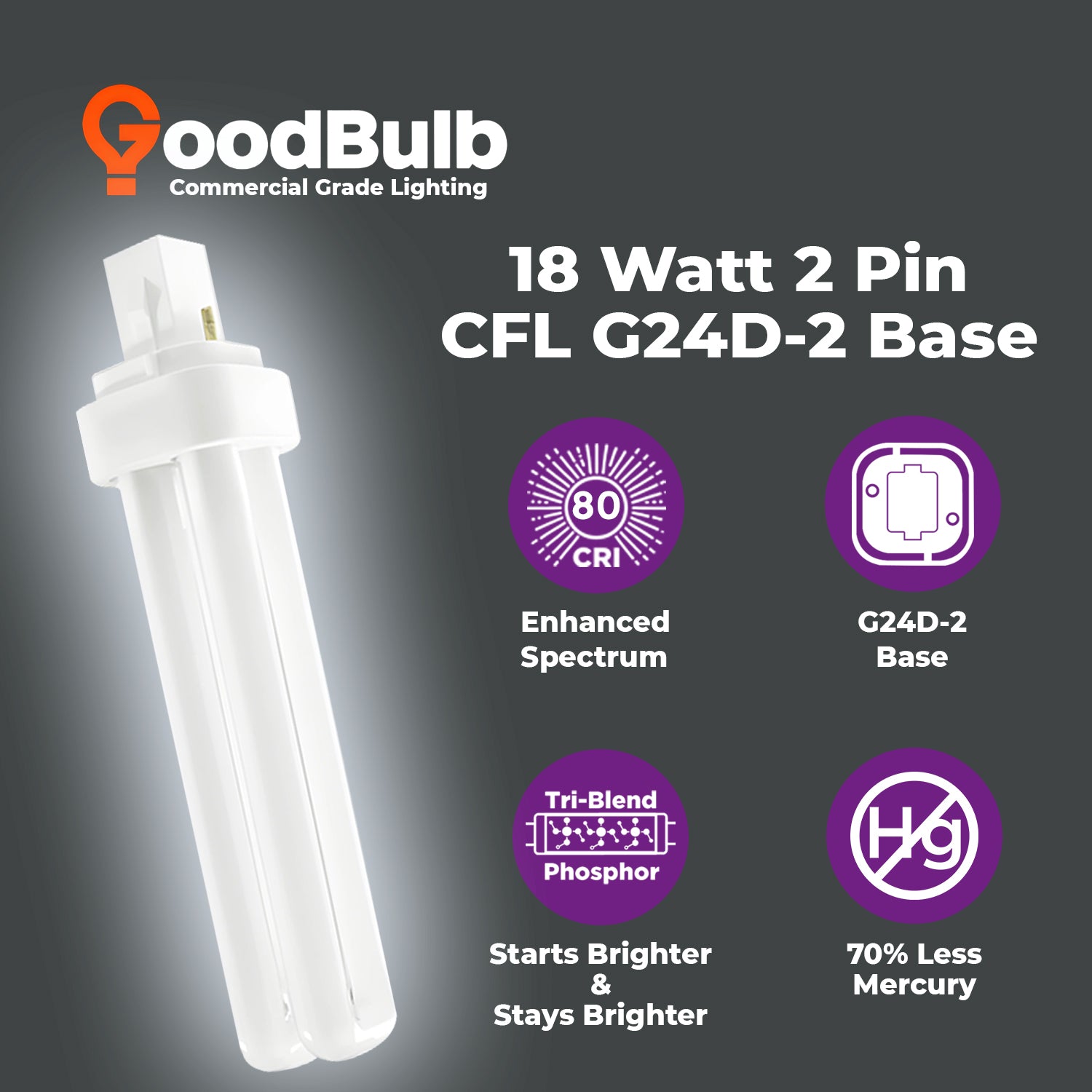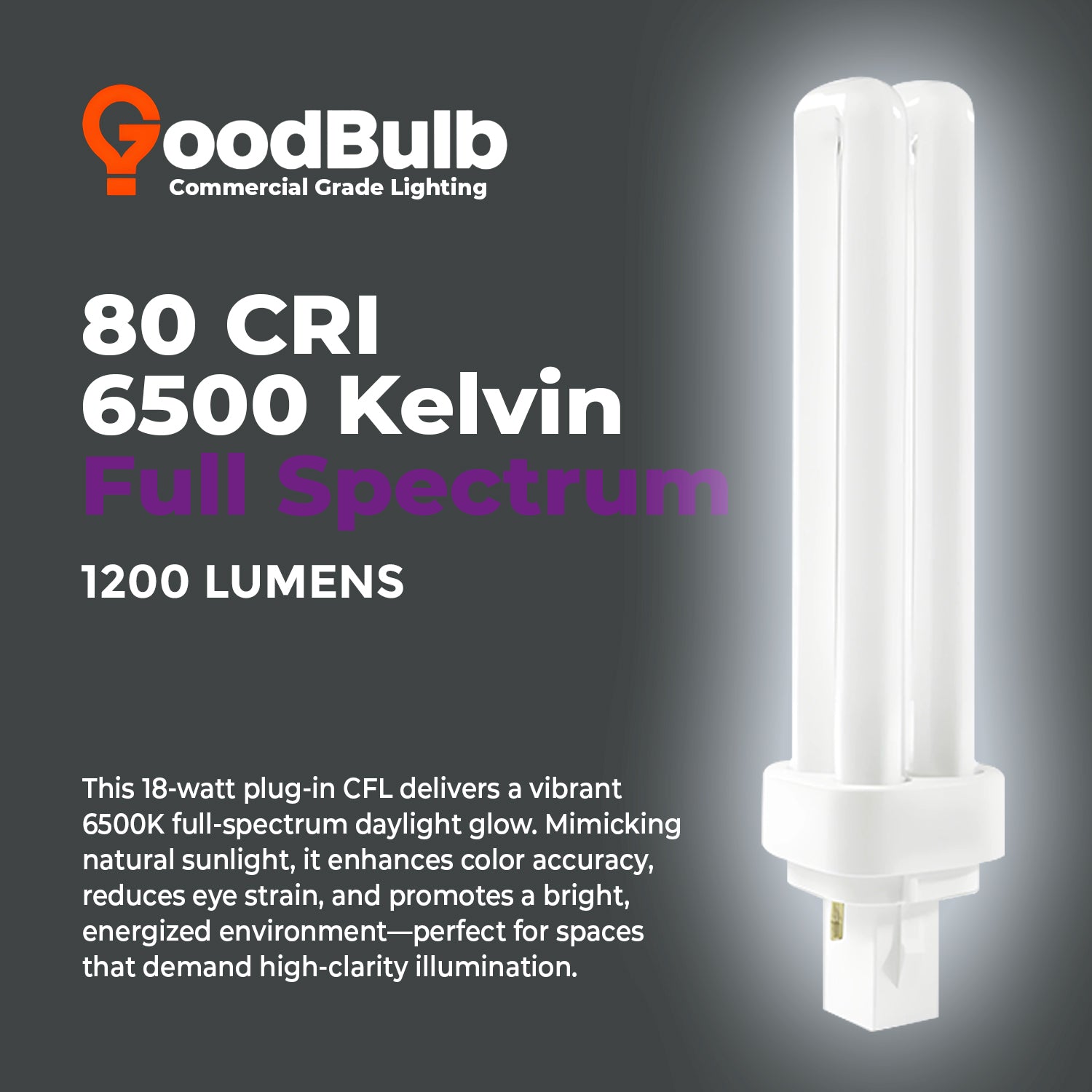 The GoodBulb 18 Watt CFL Plug-In Light Bulb delivers brilliant, full-spectrum daylight at a crisp 6500 Kelvin—engineered to replicate natural sunlight with energizing clarity. Designed for professional and precision-driven environments, this double twin-tube compact fluorescent lamp outputs a powerful 1200 lumens while using only 18 watts of energy, offering superior brightness without excessive power consumption.