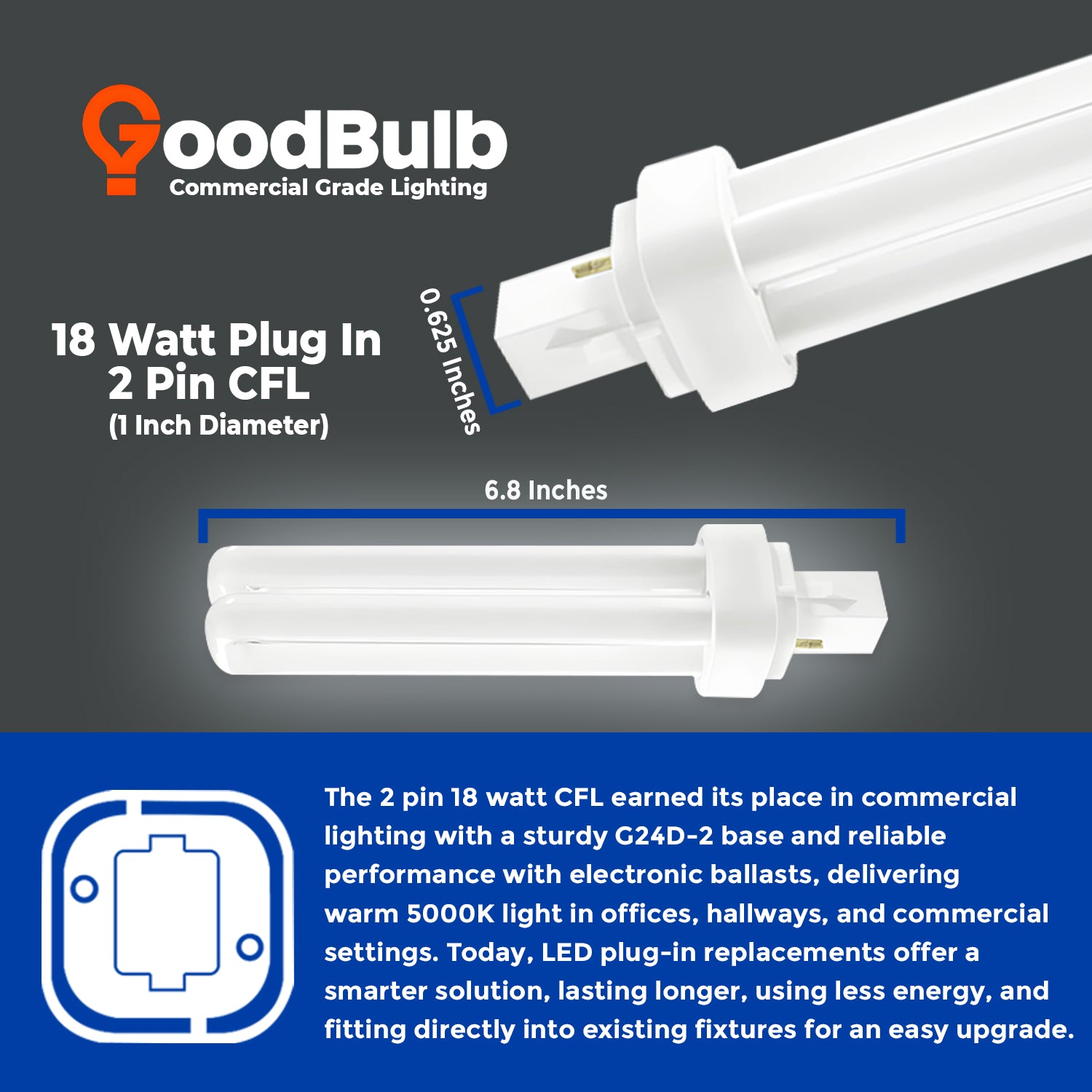 The GoodBulb 18 Watt CFL Plug-In Light Bulb provides brilliant illumination with a sharp 5000K pure white color temperature—engineered for applications where clarity, brightness, and energy efficiency are key. This high-output double twin-tube compact fluorescent lamp produces 1200 lumens while consuming only 18 watts, making it an excellent choice for commercial, institutional, and industrial environments.