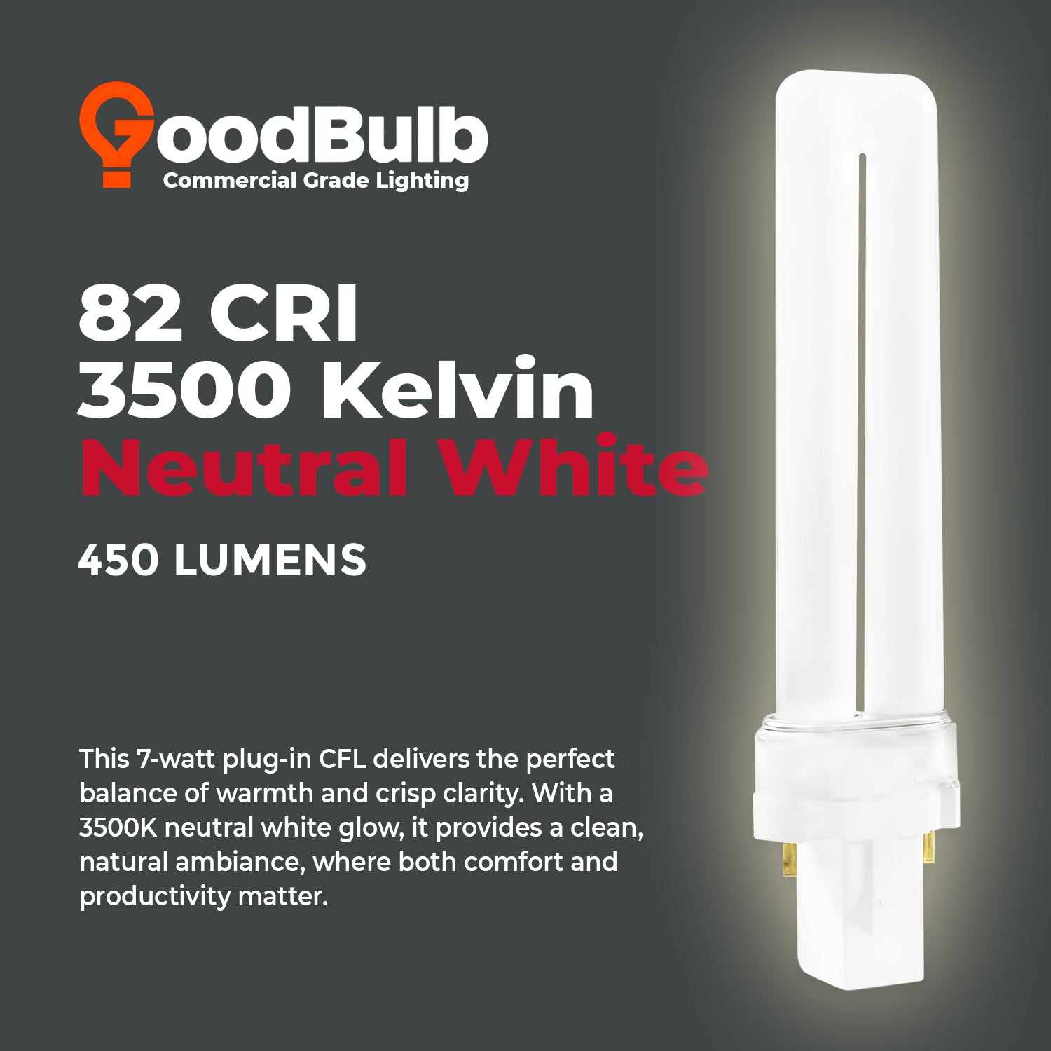 The GoodBulb 7 Watt CFL Plug-In Light Bulb provides efficient, steady illumination with a clean 3500K neutral white glow. This balanced color temperature bridges the warmth of soft white with the clarity of cool white, making it perfect for workspaces, kitchens, offices, and anywhere you need functional lighting that still feels comfortable. Consuming just 7 watts while outputting 450 lumens, this lamp offers energy savings and dependable performance in compact plug-in CFL fixtures.
