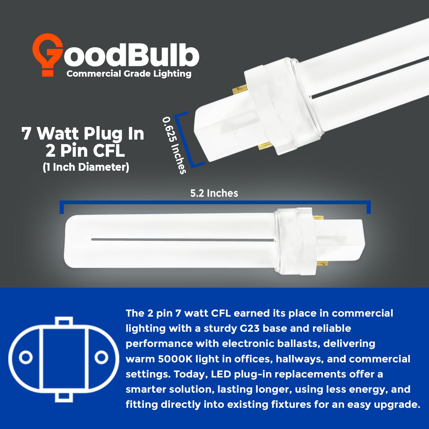The GoodBulb 7 Watt CFL Plug-In Light Bulb delivers bright, high-efficiency illumination with a vibrant 5000K pure white color temperature—ideal for environments where clean, daylight-like lighting is essential. With a compact twin-tube design and a reliable G23 2-pin base, this lamp produces 450 lumens while consuming just 7 watts, making it a cost-effective choice for homes, offices, and light commercial installations.