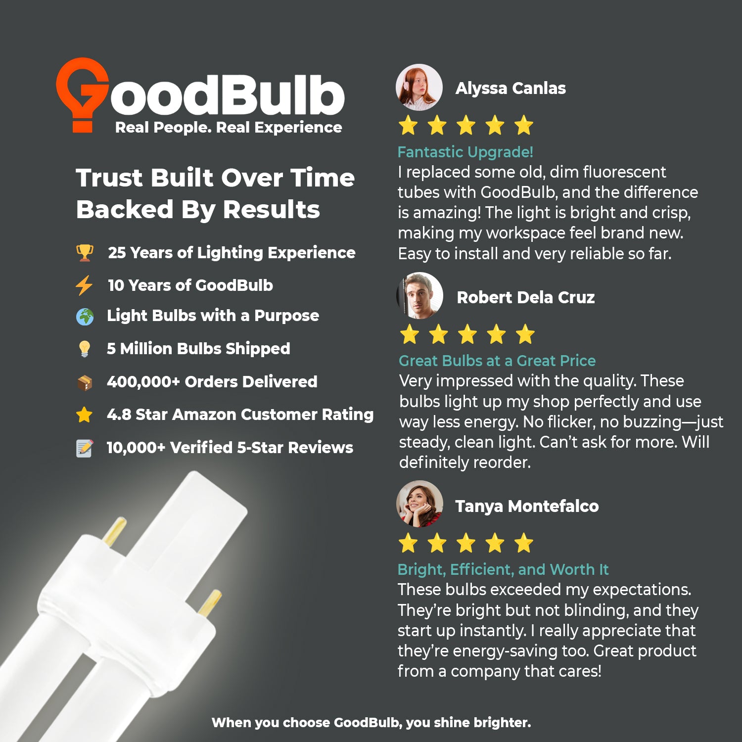 The GoodBulb 9 Watt CFL Plug-In Light Bulb delivers clean, crisp illumination with a 4100K cool white color temperature—ideal for utility rooms, task-oriented spaces, commercial applications, and work environments that demand visual clarity. Featuring a compact twin-tube design and a reliable G23 2-pin base, this energy-efficient CFL operates at just 9 watts while providing 600 lumens of consistent brightness.