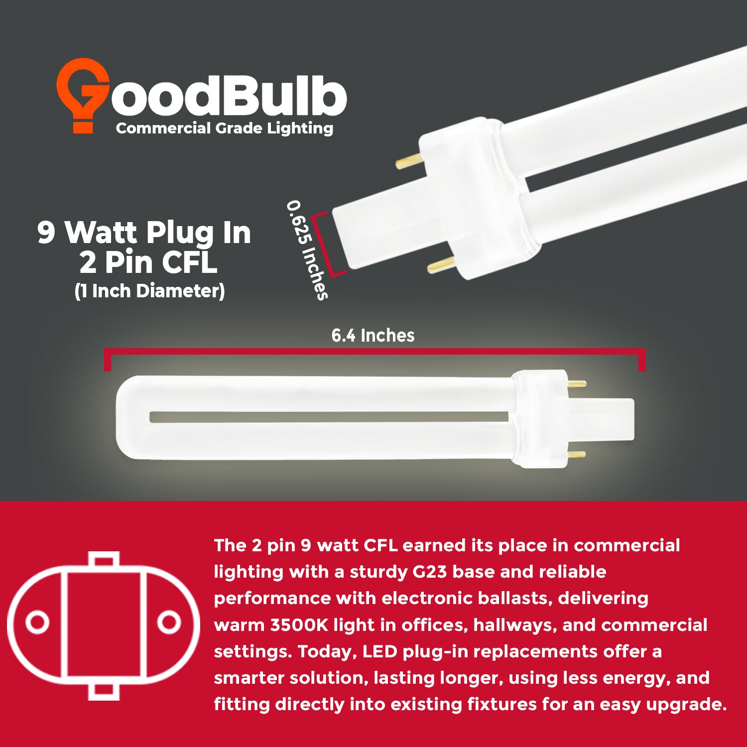 The GoodBulb 9 Watt CFL Plug-In Light Bulb provides reliable, energy-efficient lighting with a balanced 3500K neutral white tone, ideal for task areas, offices, and commercial settings. Engineered with a G23 2-pin base, this compact fluorescent lamp offers consistent performance and long operational life while consuming just 9 watts of power.