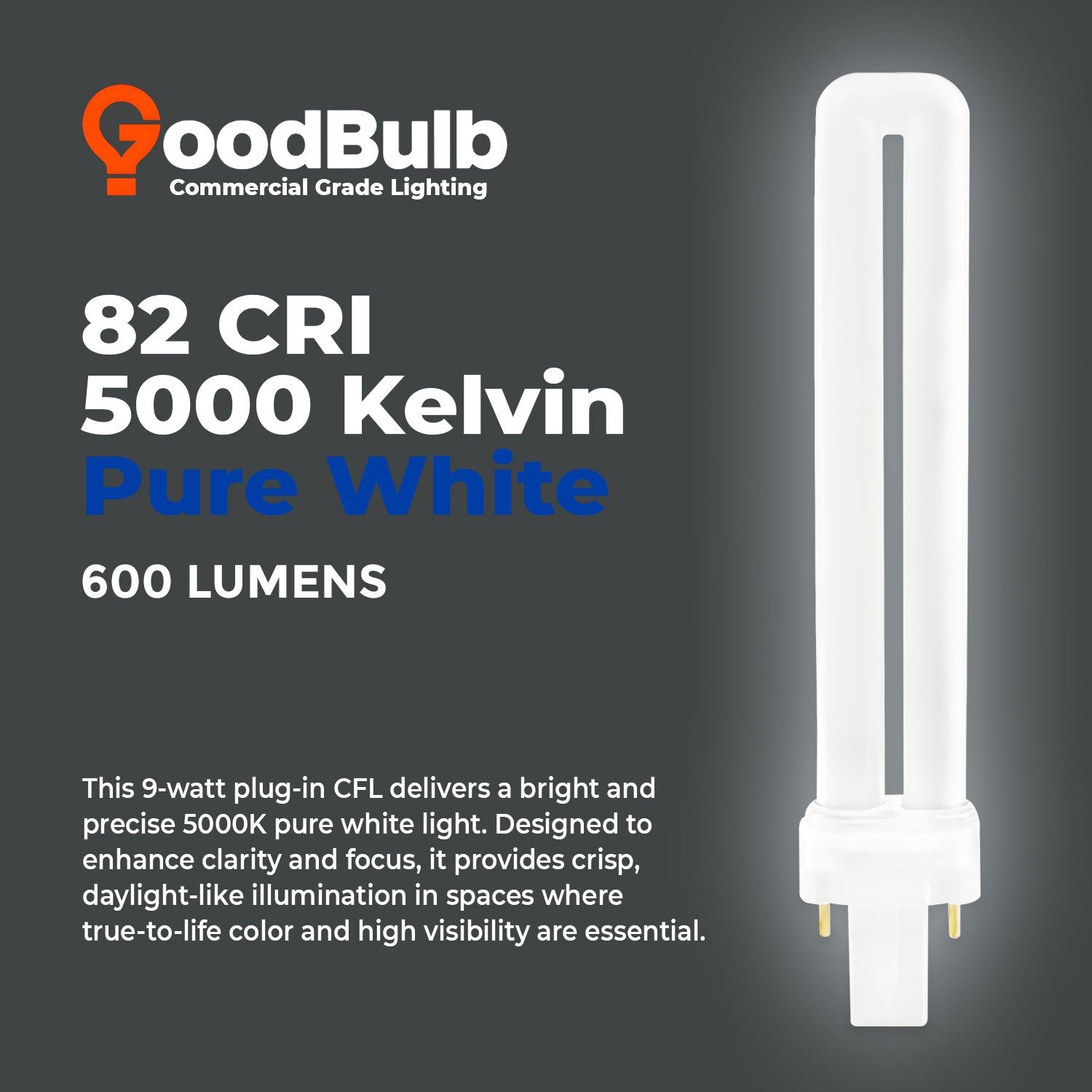 The GoodBulb 9 Watt CFL Plug-In Light Bulb delivers bright, daylight-balanced illumination with a pure white 5000K color temperature—ideal for task lighting, workspaces, and commercial environments where clarity, color accuracy, and visibility matter most. Featuring a compact twin-tube design and a dependable G23 2-pin base, this energy-efficient compact fluorescent lamp consumes just 9 watts while emitting 600 lumens of clean, consistent light.