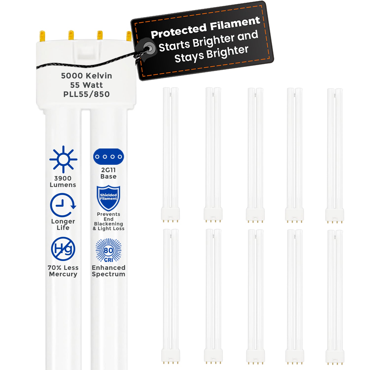 PLL55/850 - 55 Watt - 21.2 Inch Twin Tube CFL - 4-pin 2G11 Base - 5000K Pure White 3,900 Lumen - 36,000 Life Hours